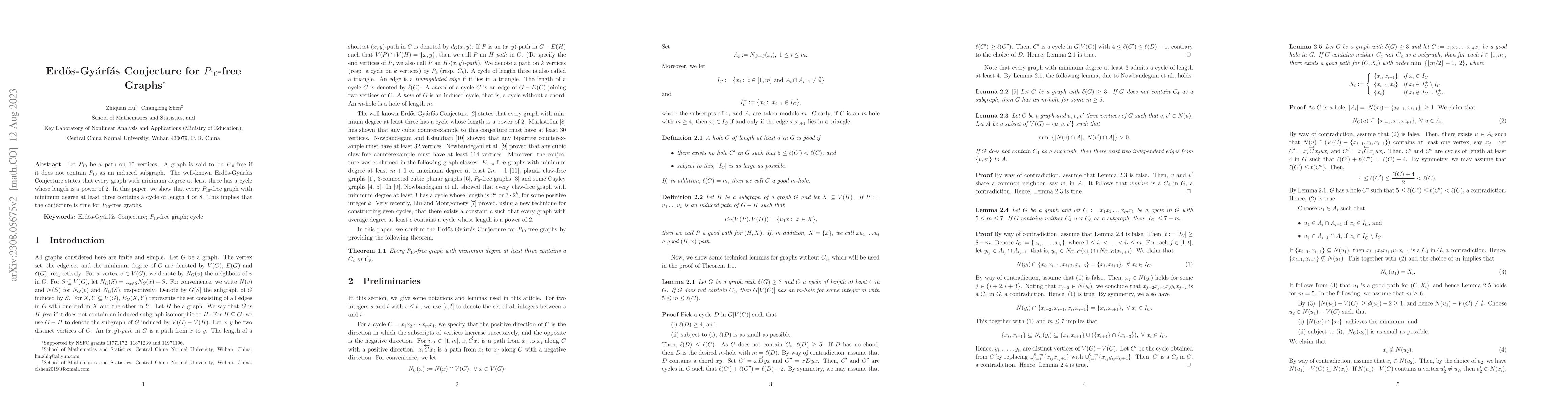 Let $P_{10}$ be a path on $10$ vertices. A graph is said to be $P_{10}$-free if it does not contain $P_{10}$ as an induced subgraph. The well-known Erd\H{o}s-Gy\'{a}rf\'{a}s Conjecture states that every graph with minimum degree at least three has a cycle whose length is a power of $2$. In this paper, we show that every $P_{10}$-free graph with minimum degree at least three contains a cycle of length $4$ or $8$. This implies that the conjecture is true for $P_{10}$-free graphs.
