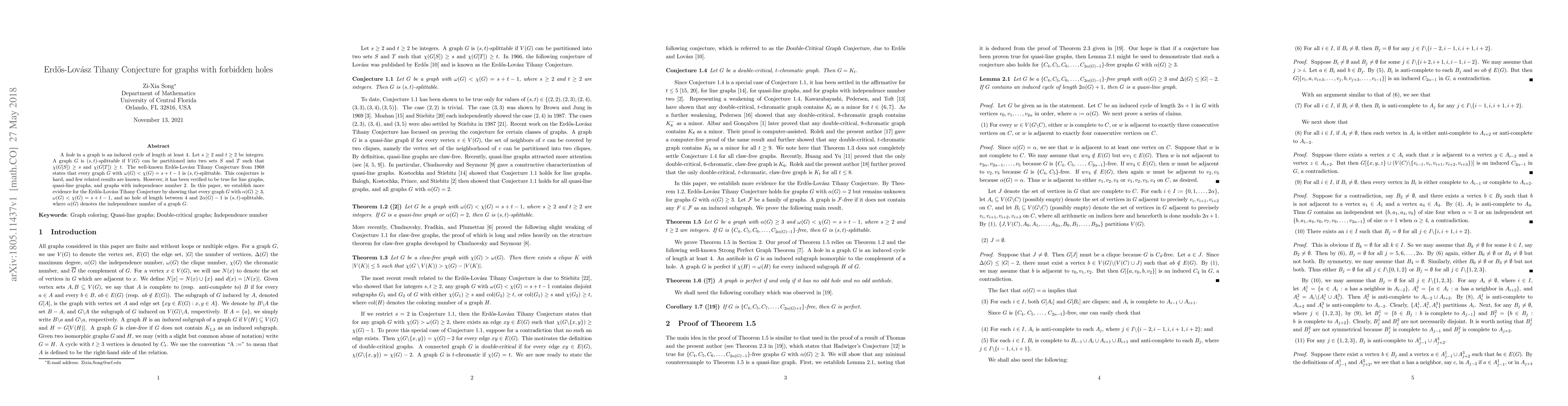 A hole in a graph is an induced cycle of length at least $4$. Let $s\ge2$ and $t\ge2$ be integers. A graph $G$ is $(s,t)$-splittable if $V(G)$ can be partitioned into two sets $S$ and $T$ such that $\chi(G[S ]) \ge s$ and $\chi(G[T ]) \ge t$. The well-known Erd\H{o}s-Lov\'asz Tihany Conjecture from 1968 states that every graph $G$ with $\omega(G) < \chi(G) = s + t - 1$ is $(s,t)$-splittable. This conjecture is hard, and few related results are known. However, it has been verified to be true for line graphs, quasi-line graphs, and graphs with independence number $2$. In this paper, we establish more evidence for the Erd\H{o}s-Lov\'asz Tihany Conjecture by showing that every graph $G$ with $\alpha(G)\ge3$, $\omega(G) < \chi(G) = s + t - 1$, and no hole of length between $4$ and $2\alpha(G)-1$ is $(s,t)$-splittable, where $\alpha(G)$ denotes the independence number of a graph $G$.