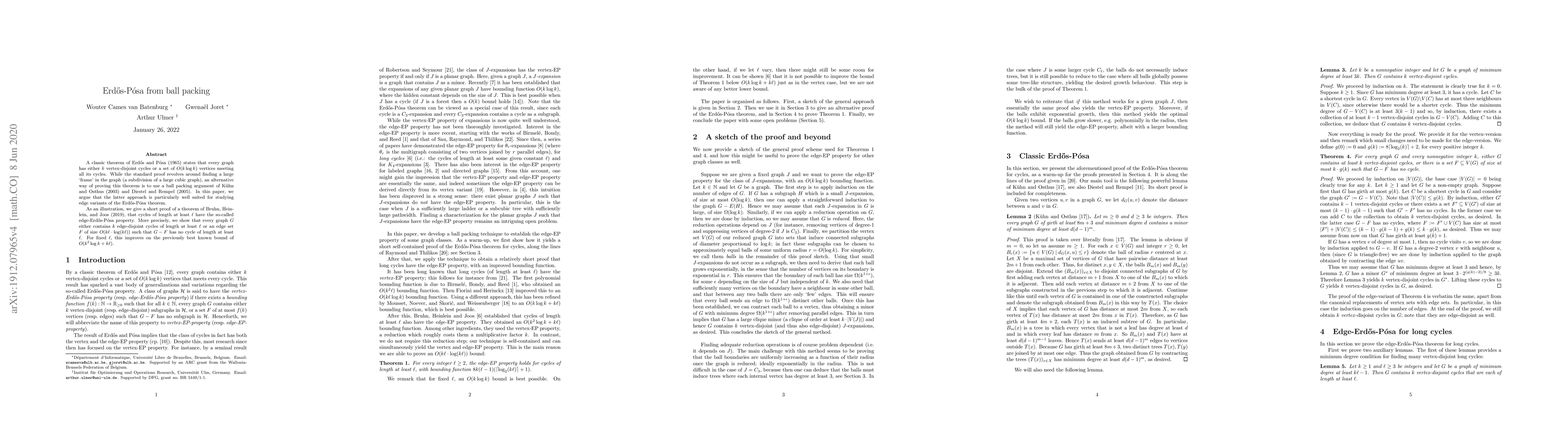 This paper presents an alternative proof of the Erdős-Pósa theorem using a ball packing argument, showing that every graph either contains $k$ edge-disjoint cycles of length at least $\ell$ or a set of edges of size $O(k\ell \log(k\ell))$ that, when removed, eliminate all cycles of length at least $\ell$. This approach improves upon previous bounds for fixed $\ell$.