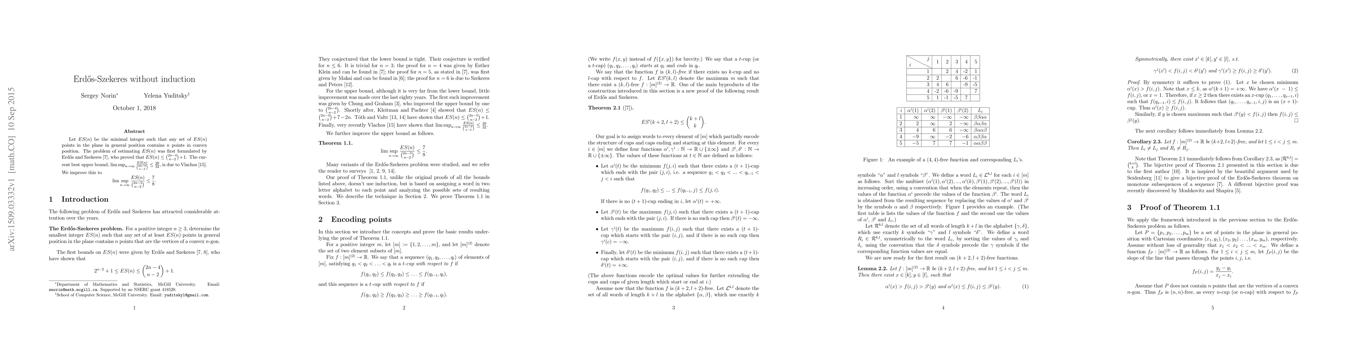 Let $ES(n)$ be the minimal integer such that any set of $ES(n)$ points in the plane in general position contains $n$ points in convex position. The problem of estimating $ES(n)$ was first formulated by Erd\H{o}s and Szekeres, who proved that $ES(n) \leq \binom{2n-4}{n-2}+1$. The current best upper bound, $\lim\sup_{n \to \infty} \frac{ES(n)}{\binom{2n-5}{n-2}}\le \frac{29}{32}$, is due to Vlachos. We improve this to $$\lim\sup_{n \to \infty} \frac{ES(n)}{\binom{2n-5}{n-2}}\le \frac{7}{8}.$$