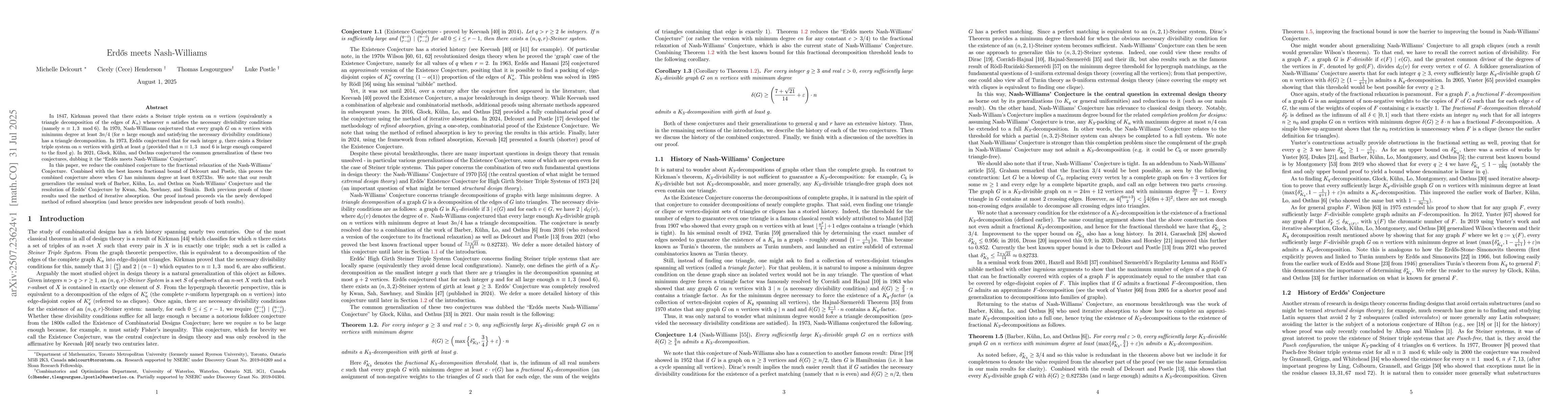 In 1847, Kirkman proved that there exists a Steiner triple system on $n$ vertices (equivalently a triangle decomposition of the edges of $K_n$) whenever $n$ satisfies the necessary divisibility conditions (namely $n\equiv 1,3 \mod 6$). In 1970, Nash-Williams conjectured that every graph $G$ on $n$ vertices with minimum degree at least $3n/4$ (for $n$ large enough and satisfying the necessary divisibility conditions) has a triangle decomposition. In 1973, Erd\H{o}s conjectured that for each integer $g$, there exists a Steiner triple system on $n$ vertices with girth at least $g$ (provided that $n\equiv 1,3 \mod 6$ is large enough compared to the fixed $g$). In 2021, Glock, K\"uhn, and Osthus conjectured the common generalization of these two conjectures, dubbing it the ``Erd\H{o}s meets Nash-Williams' Conjecture''. In this paper, we reduce the combined conjecture to the fractional relaxation of the Nash-Williams' Conjecture. Combined with the best known fractional bound of Delcourt and Postle, this proves the combined conjecture above when $G$ has minimum degree at least $0.82733n$. We note that our result generalizes the seminal work of Barber, K\"uhn, Lo, and Osthus on Nash-Williams' Conjecture and the resolution of Erd\H{o}s' Conjecture by Kwan, Sah, Sawhney, and Simkin. Both previous proofs of those results used the method of iterative absorption. Our proof instead proceeds via the newly developed method of refined absorption (and hence provides new independent proofs of both results).