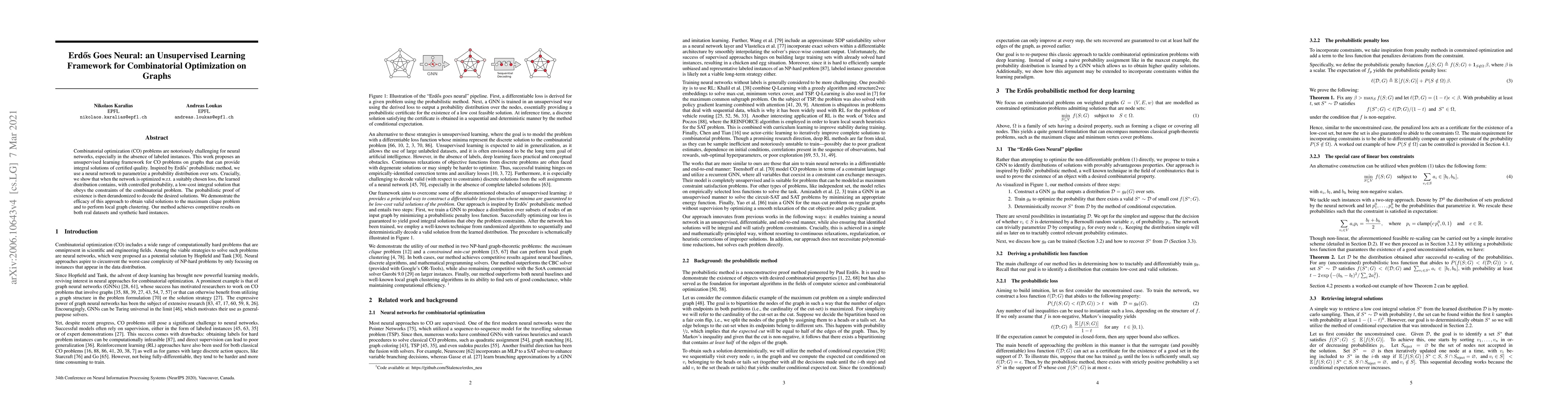 Combinatorial optimization problems are notoriously challenging for neural networks, especially in the absence of labeled instances. This work proposes an unsupervised learning framework for CO problems on graphs that can provide integral solutions of certified quality. Inspired by Erdos' probabilistic method, we use a neural network to parametrize a probability distribution over sets. Crucially, we show that when the network is optimized w.r.t. a suitably chosen loss, the learned distribution contains, with controlled probability, a low-cost integral solution that obeys the constraints of the combinatorial problem. The probabilistic proof of existence is then derandomized to decode the desired solutions. We demonstrate the efficacy of this approach to obtain valid solutions to the maximum clique problem and to perform local graph clustering. Our method achieves competitive results on both real datasets and synthetic hard instances.