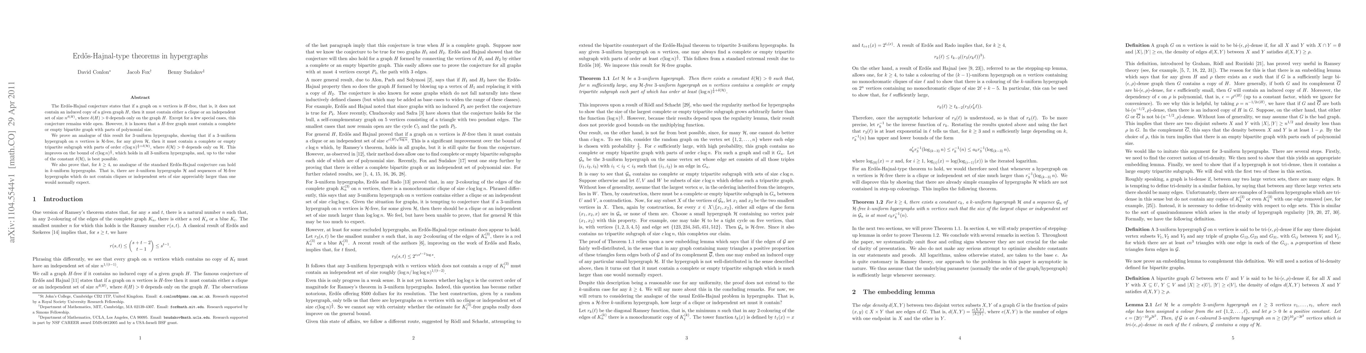 This paper establishes an Erdos-Hajnal-type result for 3-uniform hypergraphs, proving that any H-free hypergraph contains a complete or empty tripartite subgraph with parts of size c(log n)^(1/2 + d(H)). It also shows that no analogous result holds for k-uniform hypergraphs when k > 3.
