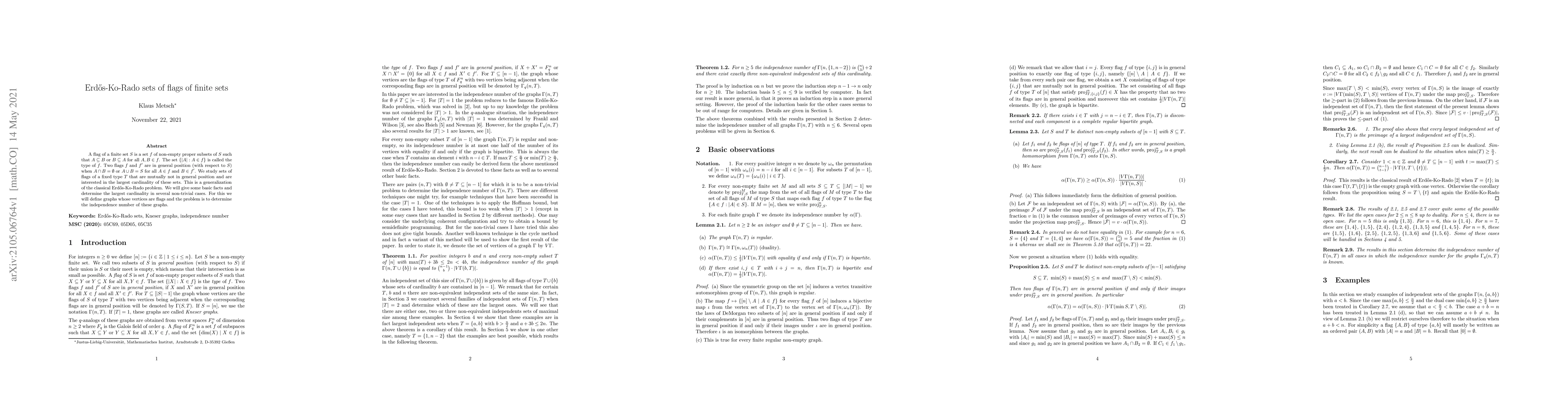This paper investigates Erdős-Ko-Rado sets of flags of finite sets, focusing on the largest cardinality of mutually non-general-position flags of a fixed type. It generalizes the classical Erdős-Ko-Rado problem and determines the independence number of associated graphs to find these maximal sets.