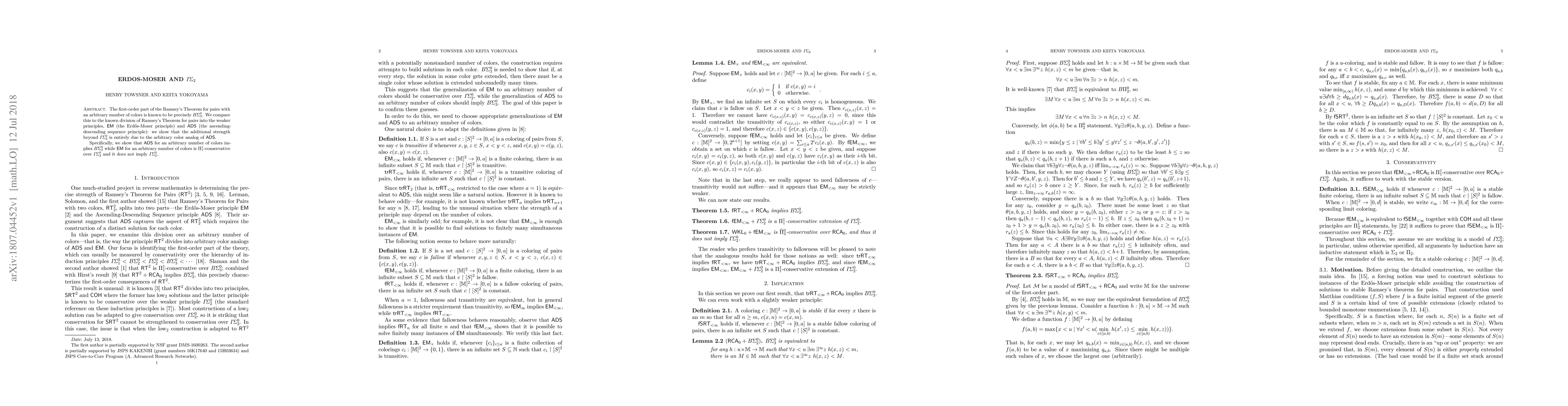 Researchers show that Erdos-Moser principle (EM) does not imply Ramsey's Theorem for pairs with an arbitrary number of colors beyond ISigma02, while the ascending-descending sequence principle (ADS) implies BSigma03.