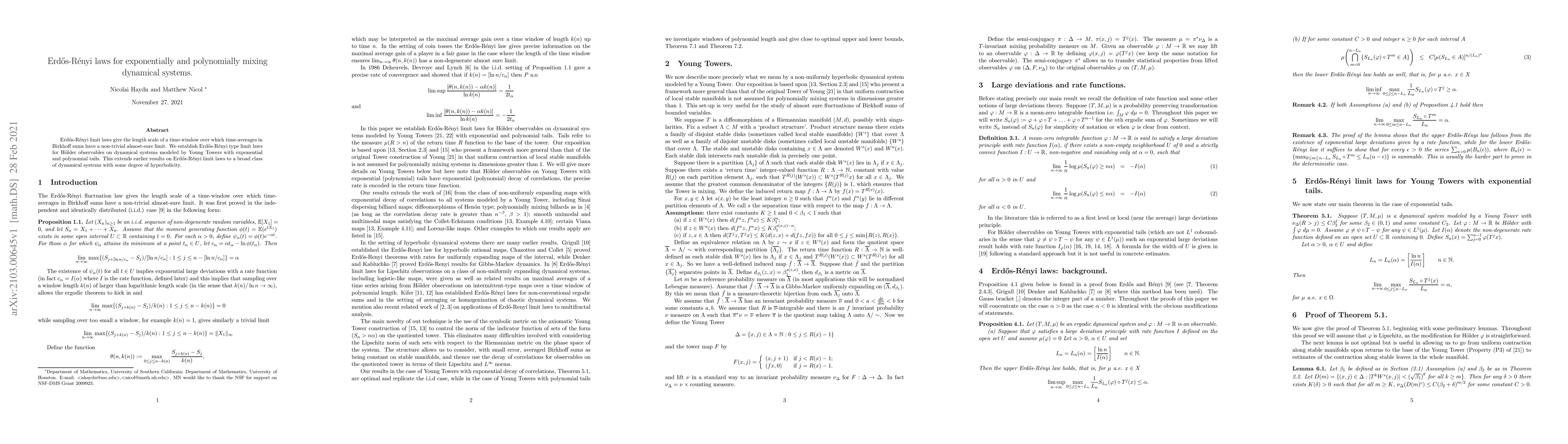 Erdos-Renyi limit laws give the length scale of a time-window over which time-averages in Birkhoff sums have a non-trivial almost-sure limit. We establish Erdos-Renyi type limit laws for Holder observables on dynamical systems modeled by Young Towers with exponential and polynomial tails. This extends earlier results on Erdos-Renyi limit laws to a broad class of dynamical systems with some degree of hyperbolicity.