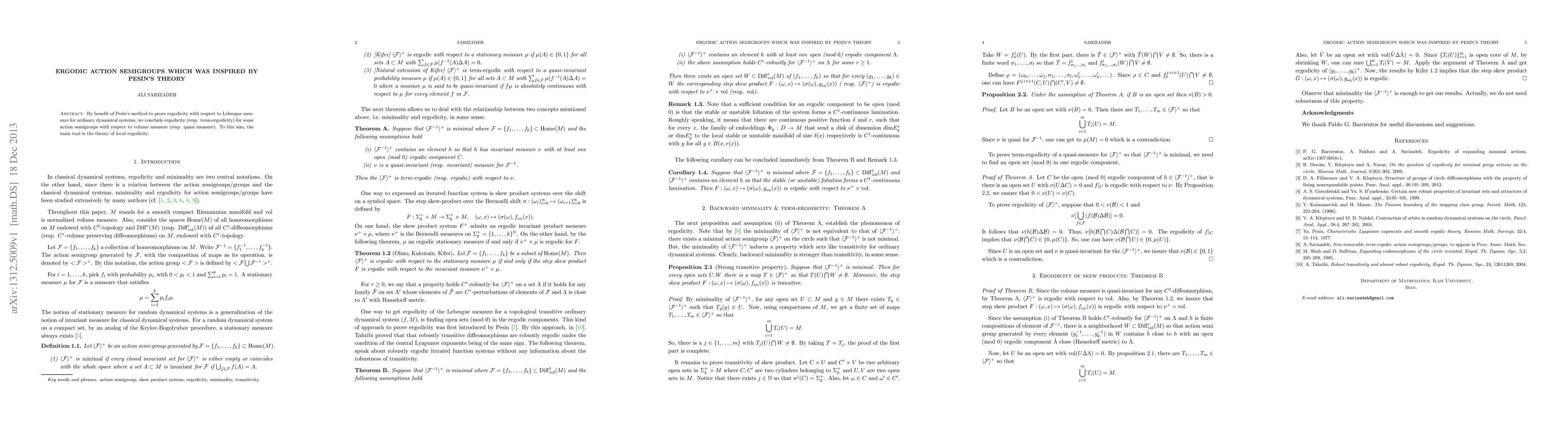 By benefit of Pesin's method to prove ergodicity with respect to Lebesgue measure for ordinary dynamical systems, we conclude ergodicity (resp. term-ergodicity) for some action semigroups with respect to volume measure (resp. quasi measure). To this aim, the main tool is the theory of local ergodicity.