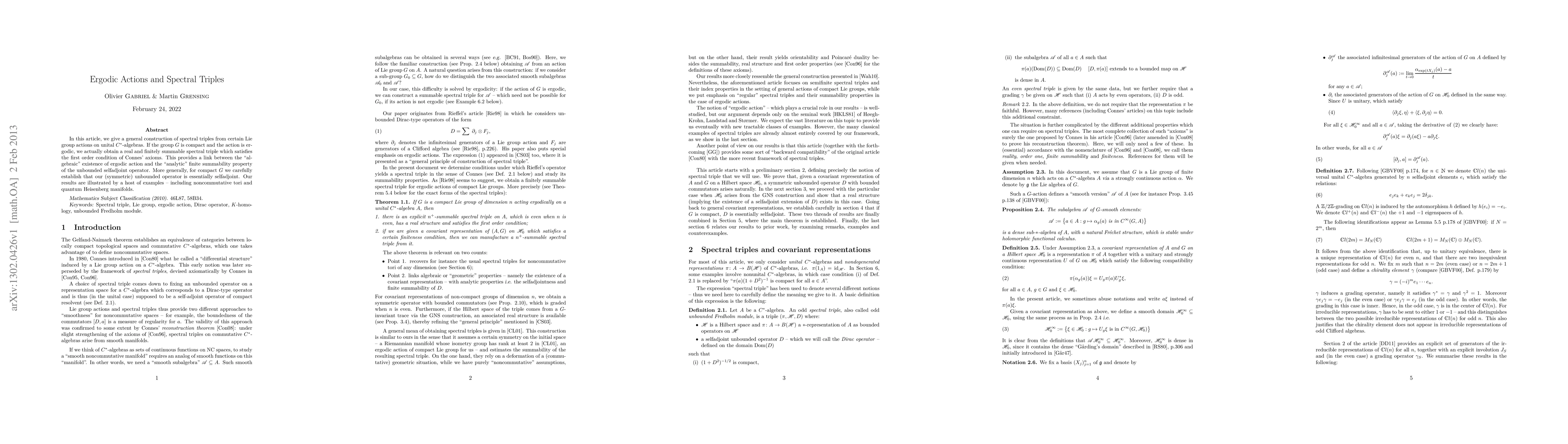 This paper constructs spectral triples from ergodic actions of compact Lie groups on unital C*-algebras, establishing a real and finitely summable spectral triple that aligns with Connes' axioms. It also proves the essential self-adjointness of the associated symmetric unbounded operator, illustrated through examples like noncommutative tori and quantum Heisenberg manifolds.