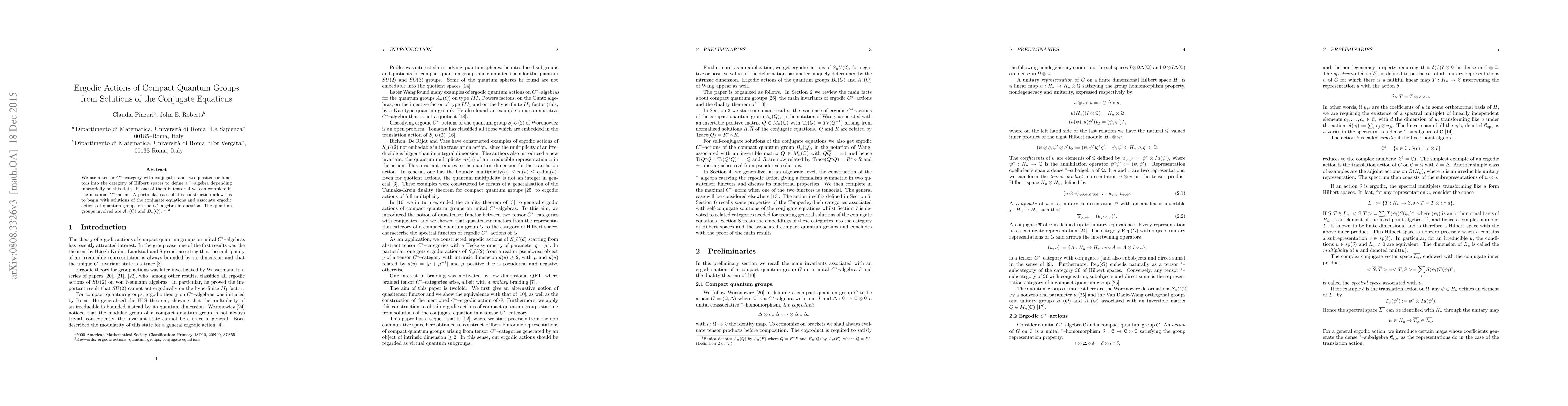 This paper defines a *-algebra from a tensor C*-category and quasitensor functors, leading to ergodic actions of compact quantum groups A_u(Q) and B_u(Q) on a C*-algebra, starting from solutions of the conjugate equations. The construction is completed in the maximal C*-norm when one functor is tensorial.