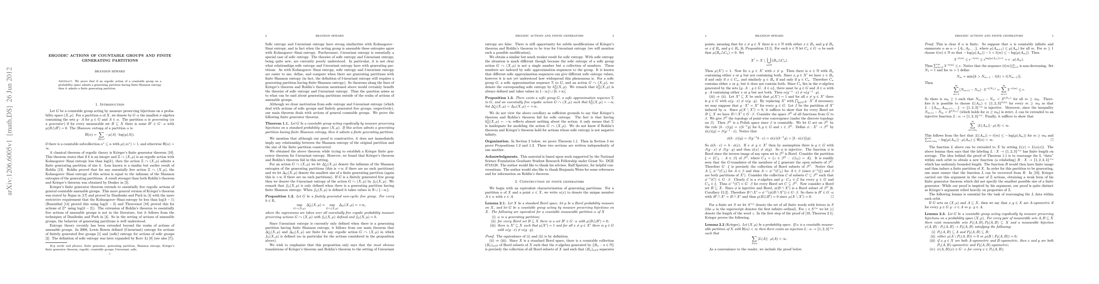 We prove that if an ergodic action of a countable group on a probability space admits a generating partition having finite Shannon entropy then it admits a finite generating partition.