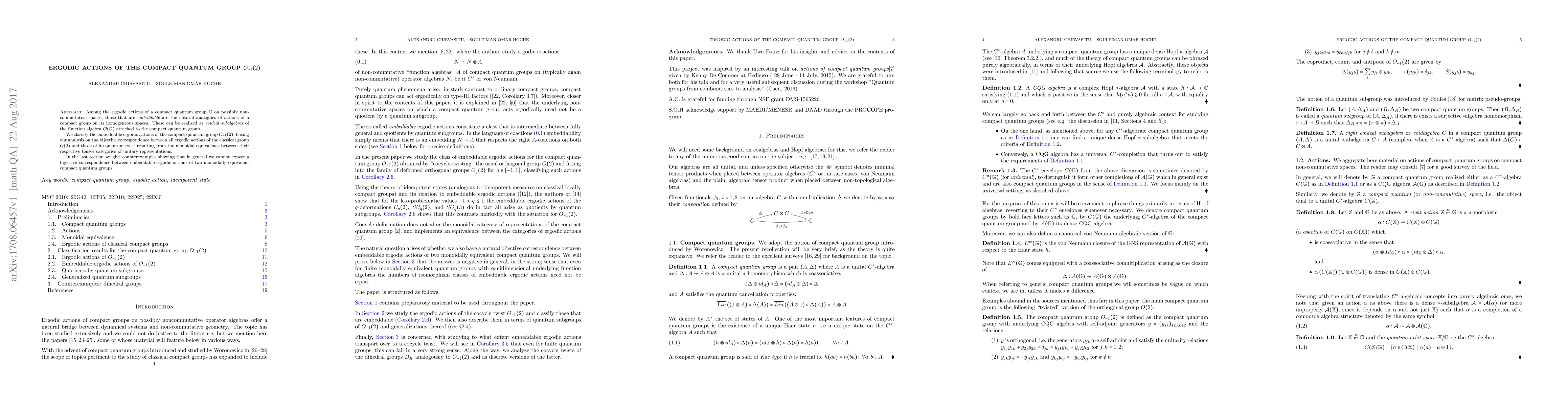 This paper classifies the embeddable ergodic actions of the compact quantum group $O_{-1}(2)$ and uses a bijective correspondence with classical $O(2)$ actions. It concludes with counterexamples demonstrating that such correspondences do not generally hold between monoidally equivalent compact quantum groups.