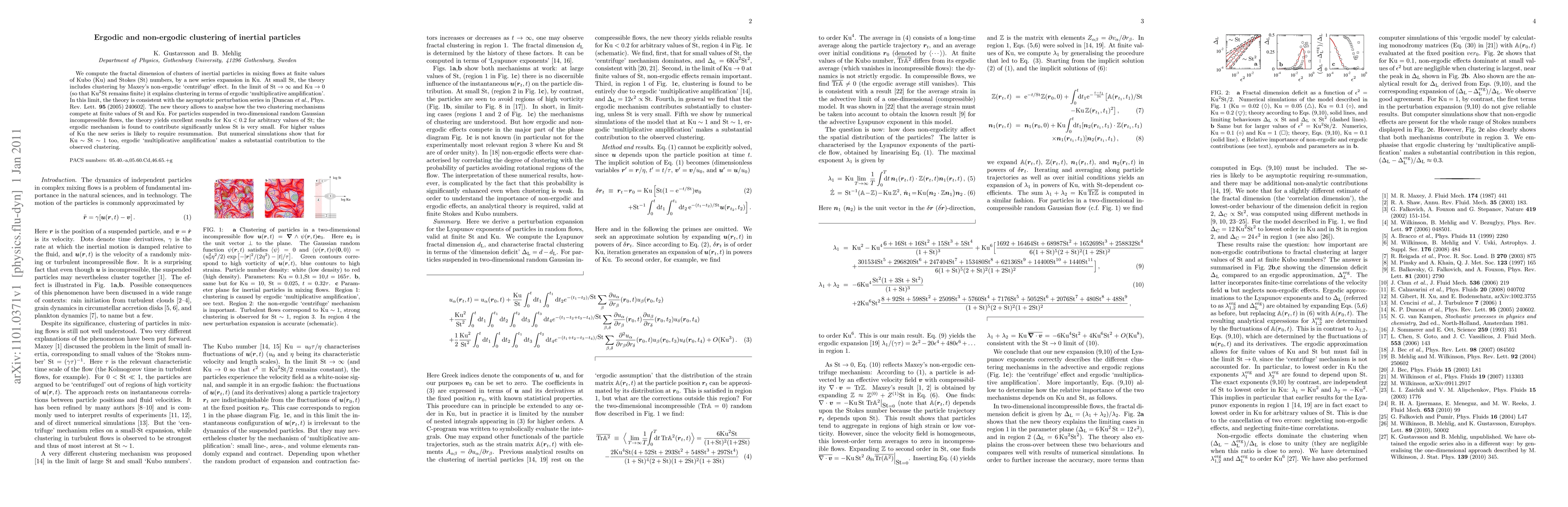 We compute the fractal dimension of clusters of inertial particles in mixing flows at finite values of Kubo (Ku) and Stokes (St) numbers, by a new series expansion in Ku. At small St, the theory includes clustering by Maxey's non-ergodic 'centrifuge' effect. In the limit of St to infinity and Ku to zero (so that Ku^2 St remains finite) it explains clustering in terms of ergodic 'multiplicative amplification'. In this limit, the theory is consistent with the asymptotic perturbation series in [Duncan et al., Phys. Rev. Lett. 95 (2005) 240602]. The new theory allows to analyse how the two clustering mechanisms compete at finite values of St and Ku. For particles suspended in two-dimensional random Gaussian incompressible flows, the theory yields excellent results for Ku < 0.2 for arbitrary values of St; the ergodic mechanism is found to contribute significantly unless St is very small. For higher values of Ku the new series is likely to require resummation. But numerical simulations show that for Ku ~ St ~ 1 too, ergodic 'multiplicative amplification' makes a substantial contribution to the observed clustering.