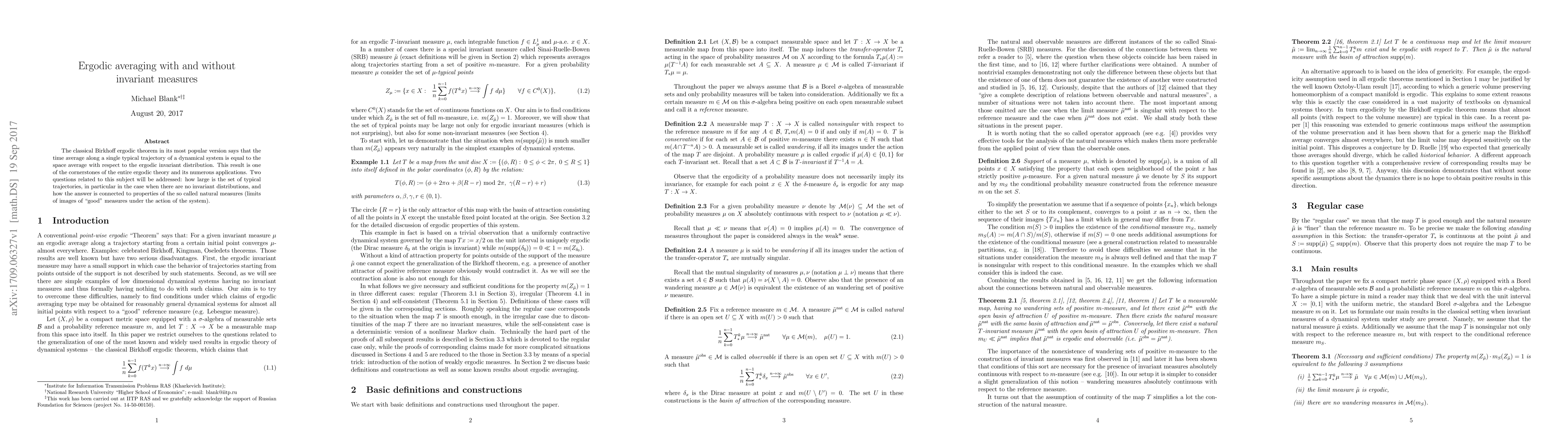 The classical Birkhoff ergodic theorem in its most popular version says that the time average along a single typical trajectory of a dynamical system is equal to the space average with respect to the ergodic invariant distribution. This result is one of the cornerstones of the entire ergodic theory and its numerous applications. Two questions related to this subject will be addressed: how large is the set of typical trajectories, in particular in the case when there are no invariant distributions, and how the answer is connected to properties of the so called natural measures (limits of images of "good" measures under the action of the system).