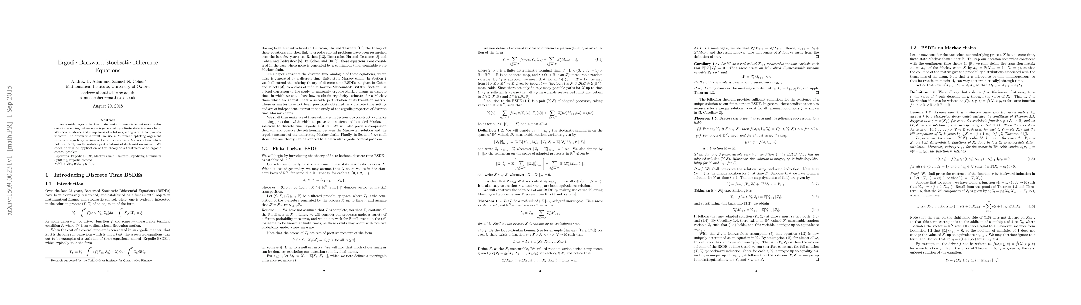 We consider ergodic backward stochastic differential equations in a discrete time setting, where noise is generated by a finite state Markov chain. We show existence and uniqueness of solutions, along with a comparison theorem. To obtain this result, we use a Nummelin splitting argument to obtain ergodicity estimates for a discrete time Markov chain which hold uniformly under suitable perturbations of its transition matrix. We conclude with an application of this theory to a treatment of an ergodic control problem.