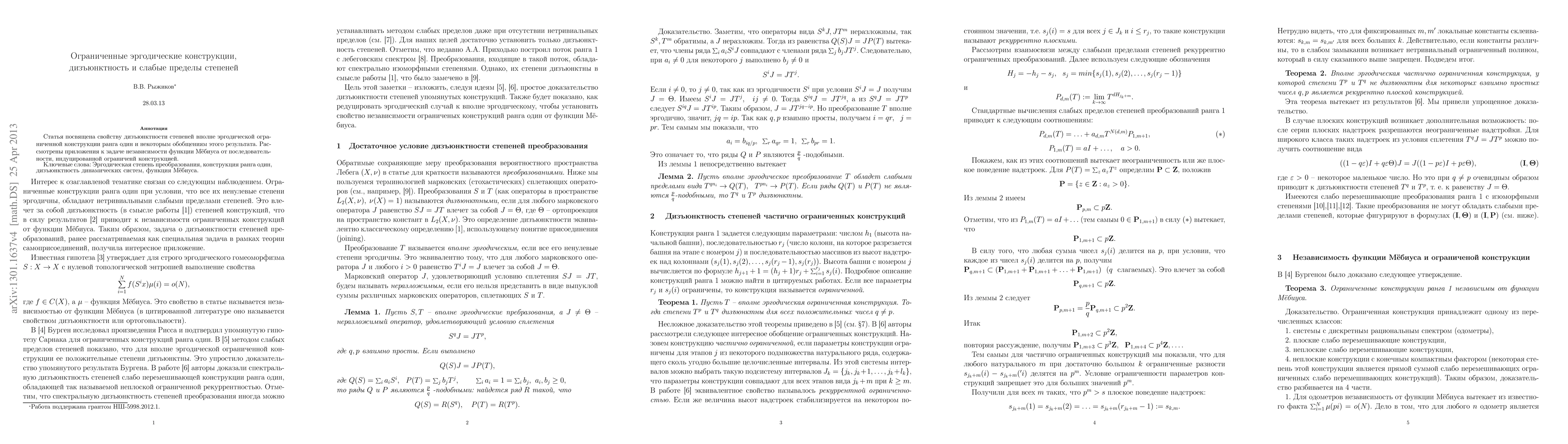 In connection with some recent results by J. Bourgain and H. Abdalaoui, M. Lemanczyk, T. De La Rue (ALR) we present a short proof of Bourgain's theorem on Mobius orthogonality property for bounded rank-one constructions. The proof of the fact (due to ALR) that bounded-recurrent constructions with Markov self-similarity have to be flat-recurrent is simplified as well.(v4 in Russian)