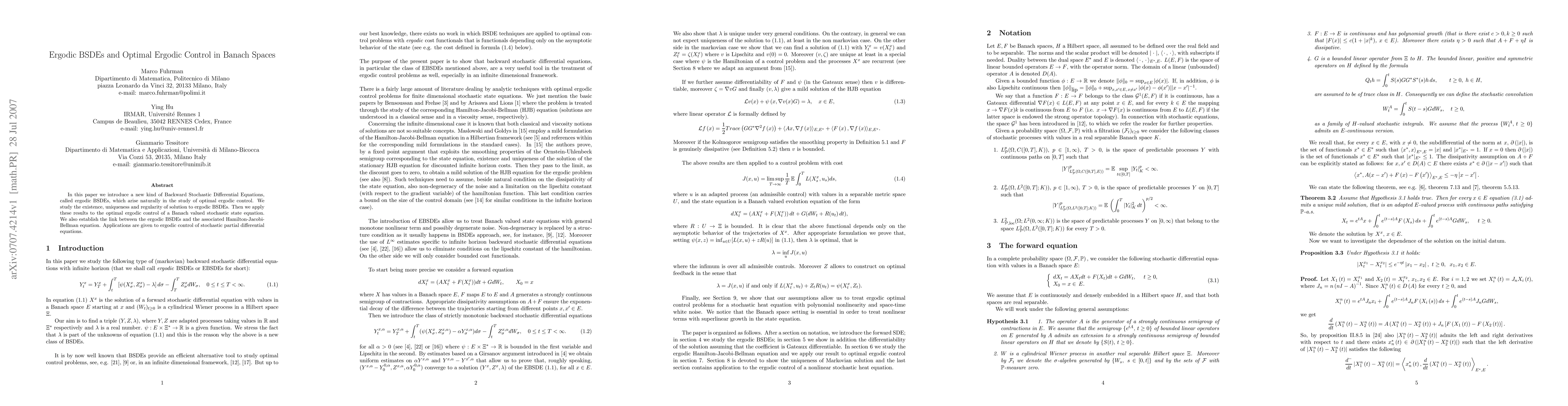 This paper introduces ergodic Backward Stochastic Differential Equations (BSDEs) relevant to optimal ergodic control, proving their existence, uniqueness, and regularity. It applies these results to the optimal control of Banach-valued stochastic state equations and establishes a connection to the Hamilton-Jacobi-Bellman equation, with applications to ergodic control of stochastic partial differential equations.
