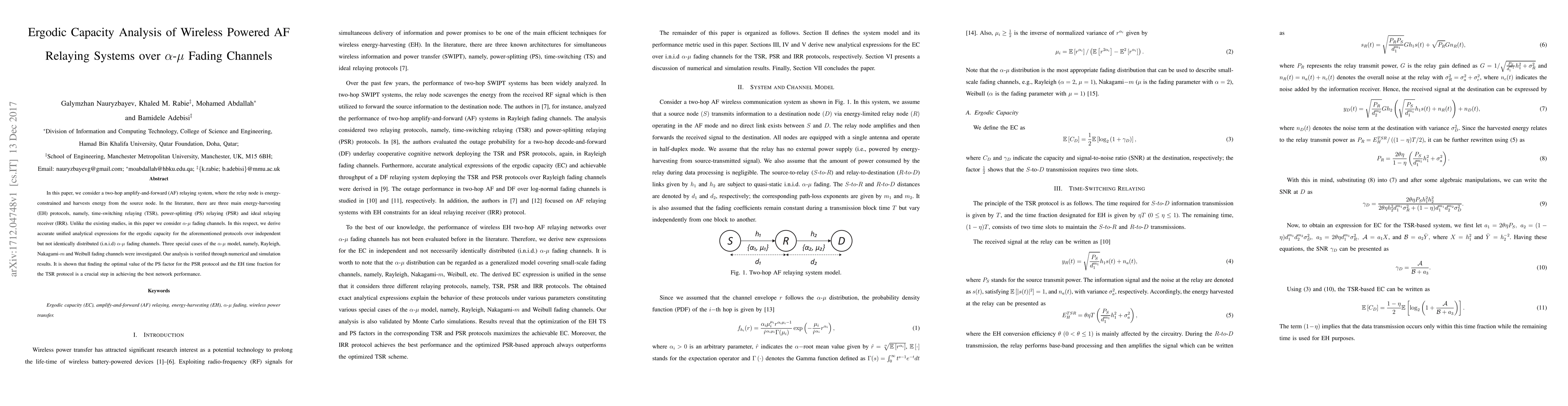 In this paper, we consider a two-hop amplify-and-forward (AF) relaying system, where the relay node is energy-constrained and harvests energy from the source node. In the literature, there are three main energy-harvesting (EH) protocols, namely, time-switching relaying (TSR), power-splitting (PS) relaying (PSR) and ideal relaying receiver (IRR). Unlike the existing studies, in this paper, we consider $\alpha$-$\mu$ fading channels. In this respect, we derive accurate unified analytical expressions for the ergodic capacity for the aforementioned protocols over independent but not identically distributed (i.n.i.d) $\alpha$-$\mu$ fading channels. Three special cases of the $\alpha$-$\mu$ model, namely, Rayleigh, Nakagami-mandWeibull fading channels were investigated. Our analysis is verified through numerical and simulation results. It is shown that finding the optimal value of the PS factor for the PSR protocol and the EH time fraction for the TSR protocol is a crucial step in achieving the best network performance.