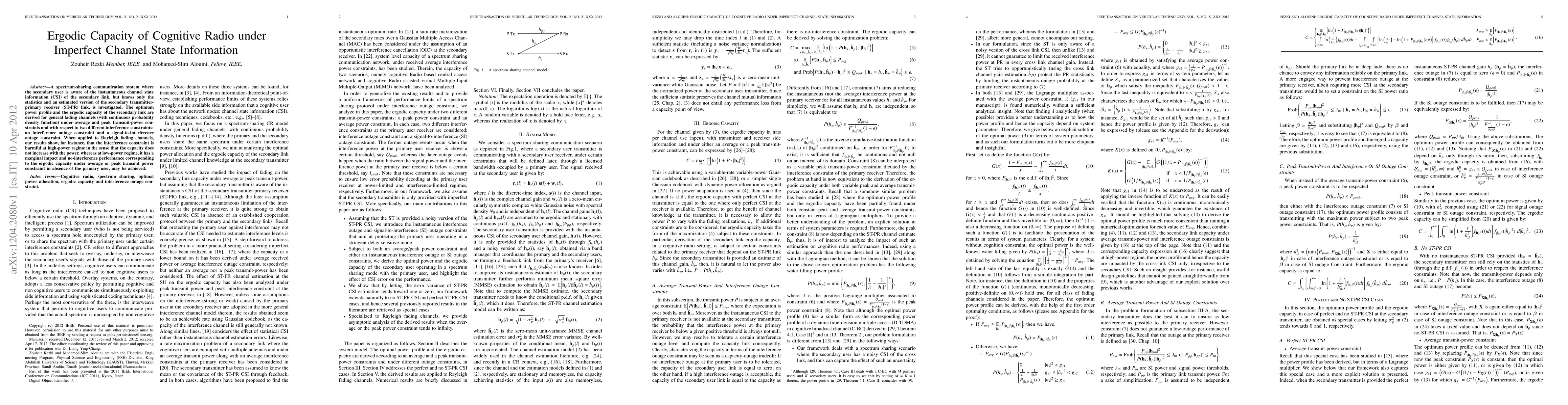 This paper investigates the ergodic capacity of a cognitive radio system under imperfect channel state information, deriving optimal power profiles and capacities for general fading channels under various transmit-power and interference constraints. Results show that interference constraints significantly impact capacity at high power levels, while having minimal effect at low power levels.