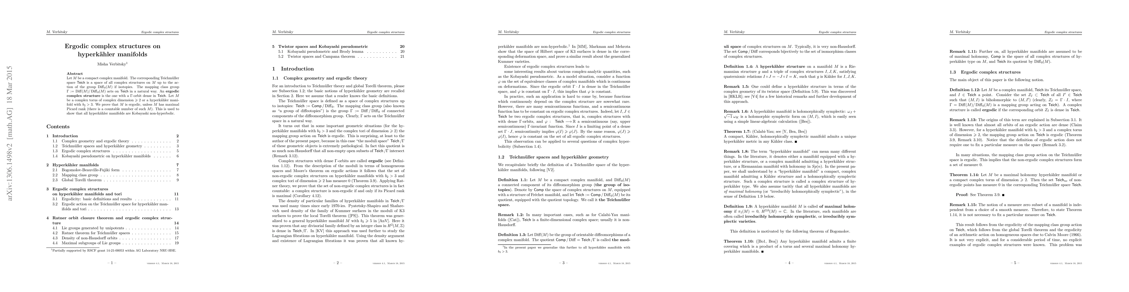 Two-line summary: This paper studies ergodic complex structures on hyperkähler manifolds, proving that a compact complex manifold $M$ is ergodic unless it has maximal Picard rank, and uses this result to demonstrate that all hyperkähler manifolds are Kobayashi non-hyperbolic. Ergodic structures are characterized by a dense orbit under the action of the mapping class group on the Teichmüller space of complex structures.