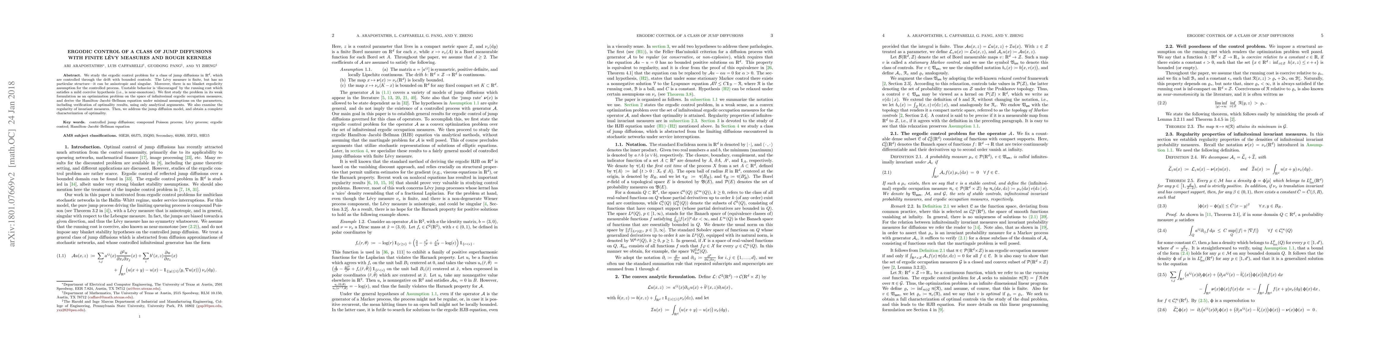 We study the ergodic control problem for a class of jump diffusions in $\mathbb{R}^d$, which are controlled through the drift with bounded controls. The Levy measure is finite, but has no particular structure; it can be anisotropic and singular. Moreover, there is no blanket ergodicity assumption for the controlled process. Unstable behavior is `discouraged' by the running cost which satisfies a mild coercive hypothesis (i.e., is near-monotone). We first study the problem in its weak formulation as an optimization problem on the space of infinitesimal ergodic occupation measures, and derive the Hamilton-Jacobi-Bellman equation under minimal assumptions on the parameters, including verification of optimality results, using only analytical arguments. We also examine the regularity of invariant measures. Then, we address the jump diffusion model, and obtain a complete characterization of optimality.