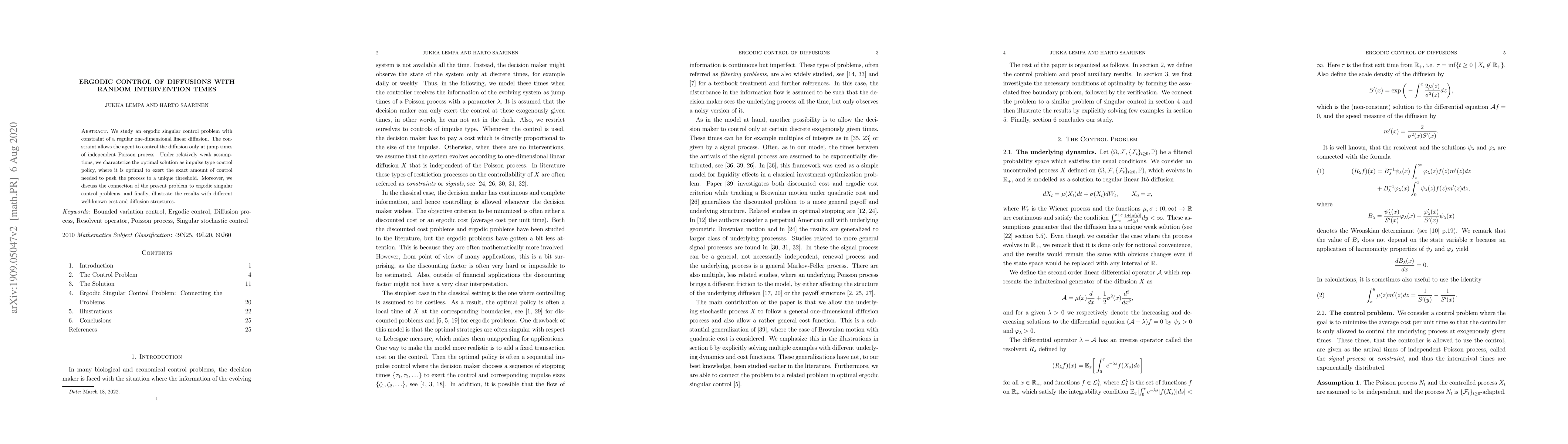 We study an ergodic singular control problem with constraint of a regular one-dimensional linear diffusion. The constraint allows the agent to control the diffusion only at jump times of independent Poisson process. Under relatively weak assumptions, we characterize the optimal solution as impulse type control policy, where it is optimal to exert the exact amount of control needed to push the process to a unique threshold. Moreover, we discuss the connection of the present problem to ergodic singular control problems, and finally, illustrate the results with different well-known cost and diffusion structures.