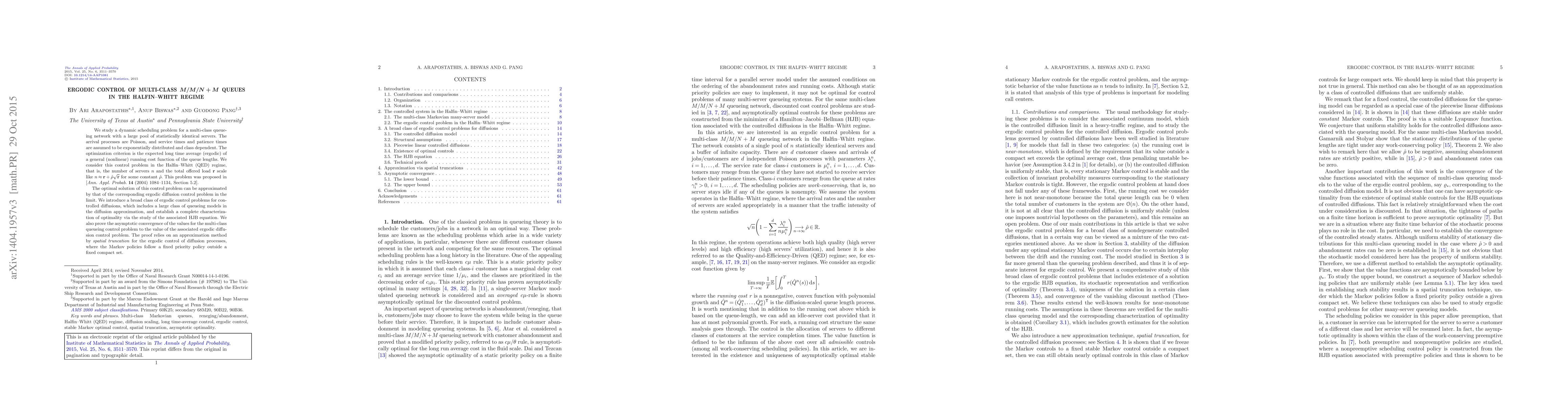 This paper studies dynamic scheduling for multi-class queues with many servers in the Halfin-Whitt regime, optimizing the long-term average cost of queue lengths. The optimal control is approximated by an ergodic diffusion control problem, with convergence proven via spatial truncation methods.