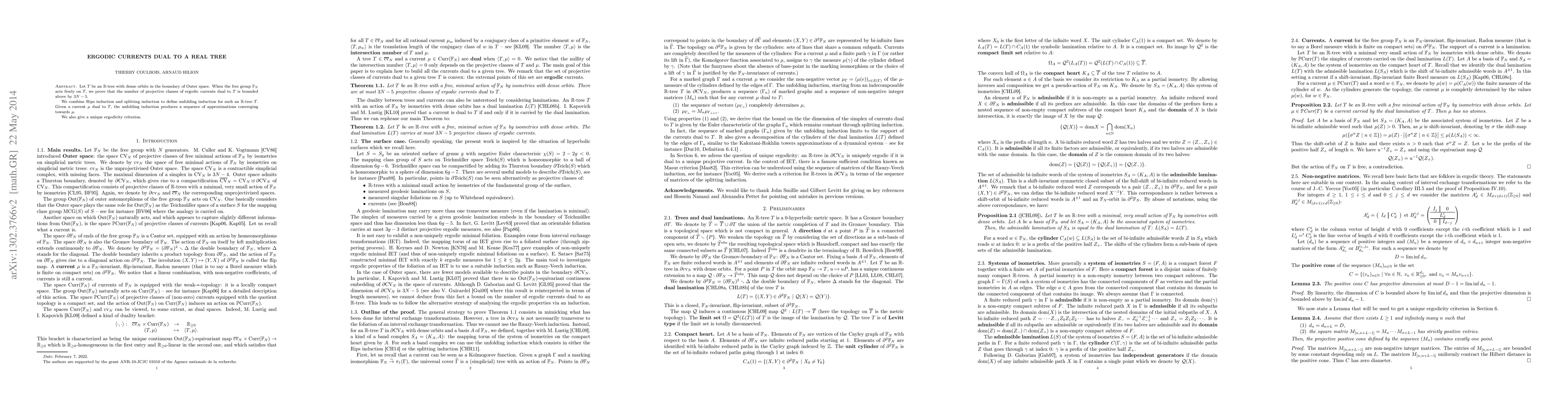Let $T$ be an $\R$-tree in the boundary of Outer space with dense orbits. When the free group $\FN$ acts freely on $T$, we prove that the number of projective classes of ergodic currents dual to $T$ is bounded above by $3N-5$. We combine Rips induction and splitting induction to define unfolding induction for such an $\R$-tree $T$. Given a current $\mu$ dual to $T$, the unfolding induction produces a sequence of approximations converging towards $\mu$. We also give a unique ergodicity criterion.