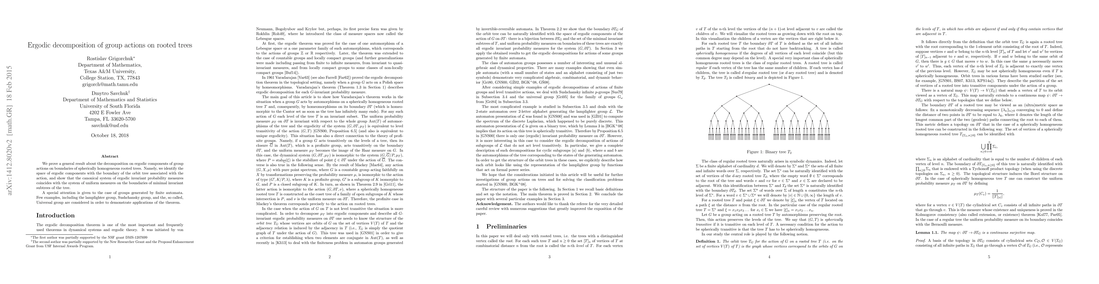 This paper proves a decomposition theorem for ergodic components of group actions on rooted trees, showing that the ergodic components correspond to the boundary of the orbit tree. It also demonstrates applications of this theorem to specific examples like the lamplighter group and the Universal group.