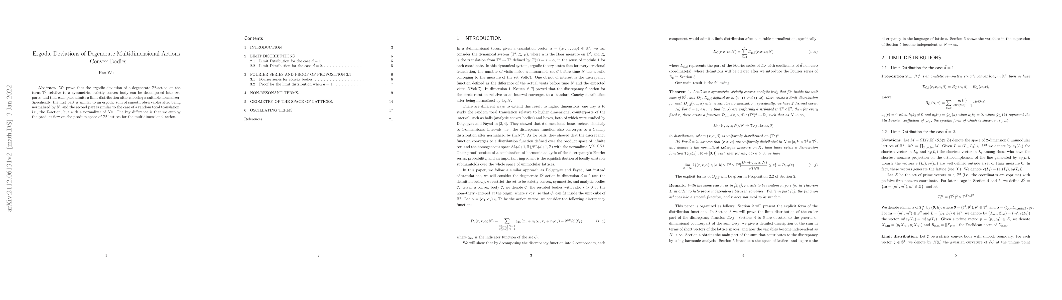 We prove that the ergodic deviation of a degenerate $\mathbb{Z}^2$-action on the torus $\mathbb{T}^2$ relative to a symmetric, strictly convex body can be decomposed into two parts, and that each part admits a limit distribution after choosing a suitable normalizer. Specifically, the first part is similar to an ergodic sum of smooth observables after being normalized by $N$, and the second part is similar to the case of a random toral translation, i.e., the $\mathbb{Z}$-action, but with a normalizer of $N^{\frac{1}{2}}$. The key difference is that we employ the product flow on the product space of $\mathbb{Z}^2$ lattices for the multidimensional action.