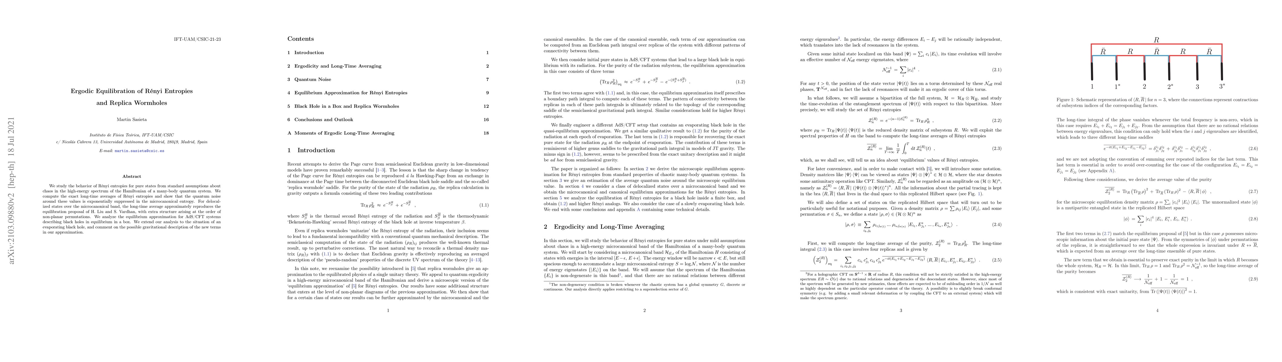 We study the behavior of R\'enyi entropies for pure states from standard assumptions about chaos in the high-energy spectrum of the Hamiltonian of a many-body quantum system. We compute the exact long-time averages of R\'enyi entropies and show that the quantum noise around these values is exponentially suppressed in the microcanonical entropy. For delocalized states over the microcanonical band, the long-time average approximately reproduces the equilibration proposal of H. Liu and S. Vardhan, with extra structure arising at the order of non-planar permutations. We analyze the equilibrium approximation for AdS/CFT systems describing black holes in equilibrium in a box. We extend our analysis to the situation of an evaporating black hole, and comment on the possible gravitational description of the new terms in our approximation.