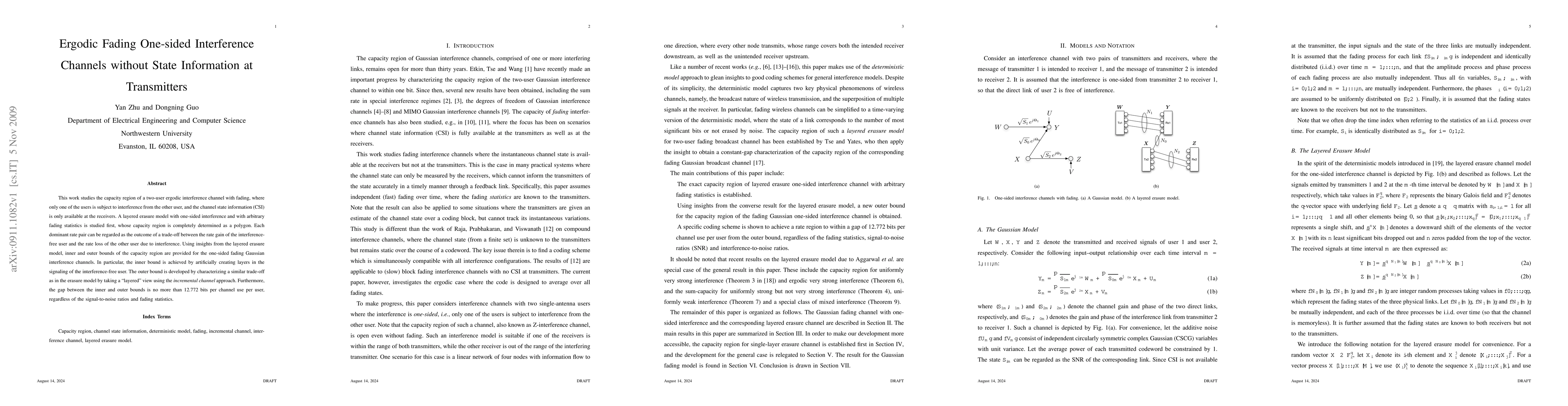 This paper explores the capacity region of a two-user ergodic interference channel with fading, where only one user experiences interference, and channel state information is available only at receivers. It determines the capacity region using a layered erasure model and provides inner and outer bounds for one-sided fading Gaussian channels, with a gap of no more than 12.772 bits per channel use per user.