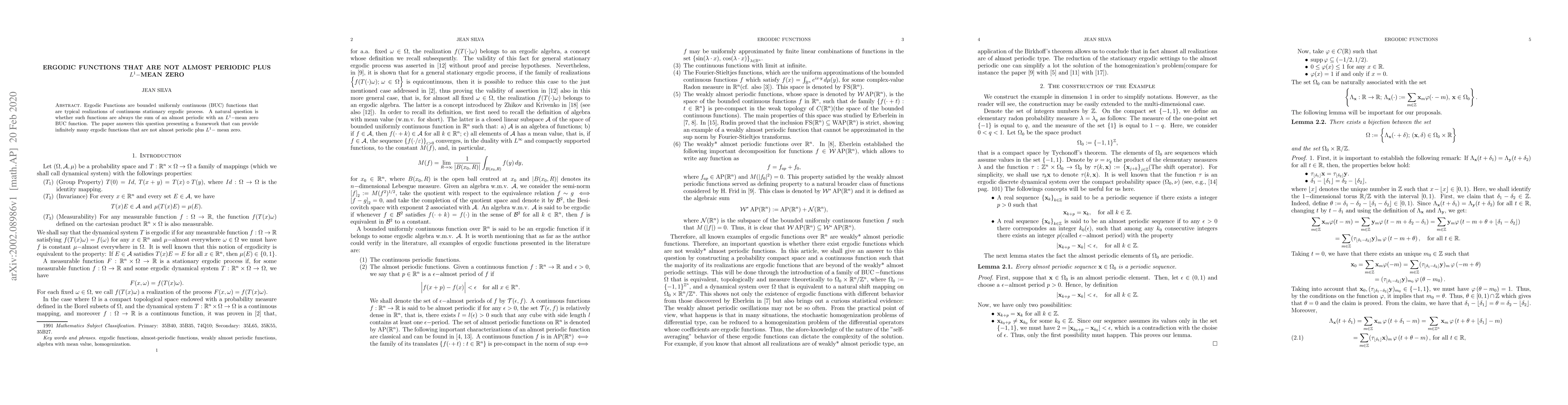 Ergodic Functions are bounded uniformly continuous $(\text{BUC})$ functions that are typical realizations of continuous stationary ergodic process. A natural question is whether such functions are always the sum of an almost periodic with an $L^1-$mean zero $\text{BUC}$ function. The paper answers this question presenting a framework that can provide infinitely many ergodic functions that are not almost periodic plus $L^1-$ mean zero.