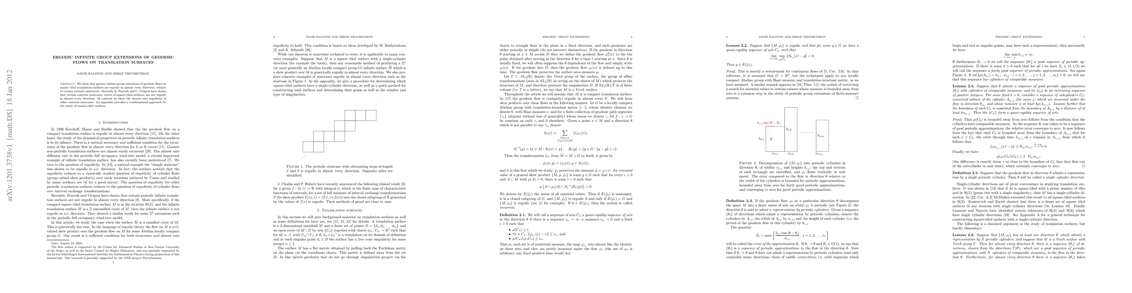 We show that generic infinite group extensions of geodesic flows on square tiled translation surfaces are ergodic in almost every direction, subject to certain natural constraints. Recently K. Fr\c{a}czek and C. Ulcigrai have shown that certain concrete staircases, covers of square-tiled surfaces, are not ergodic in almost every direction. In contrast we show the almost sure ergodicity of other concrete staircases. An appendix provides a combinatorial approach for the study of square-tiled surfaces.