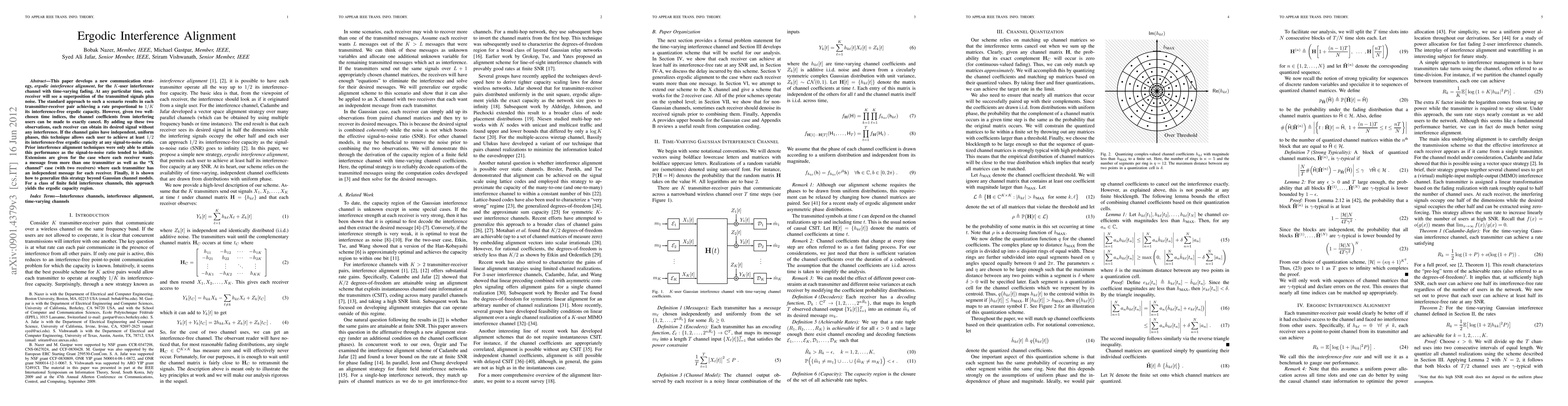 This paper introduces ergodic interference alignment, a novel communication strategy for the K-user interference channel, enabling each user to achieve at least half its interference-free ergodic capacity at any signal-to-noise ratio. It extends to multiple message scenarios and generalizes beyond Gaussian channels.