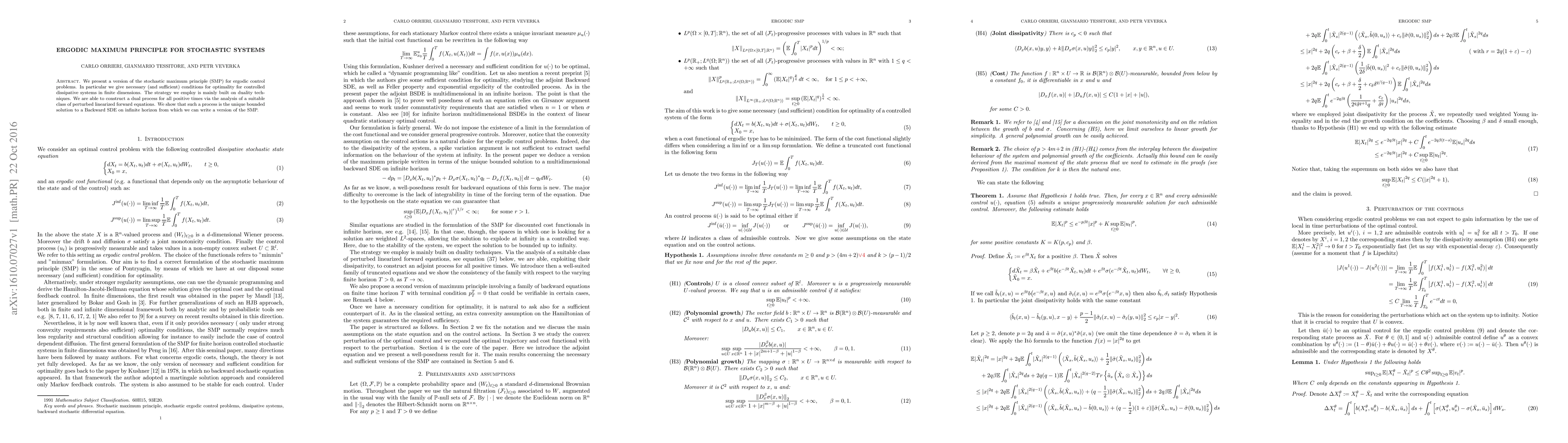 We present a version of the stochastic maximum principle (SMP) for ergodic control problems. In particular we give necessary (and sufficient) conditions for optimality for controlled dissipative systems in finite dimensions. The strategy we employ is mainly built on duality techniques. We are able to construct a dual process for all positive times via the analysis of a suitable class of perturbed linearized forward equations. We show that such a process is the unique bounded solution to a Backward SDE on infinite horizon from which we can write a version of the SMP.