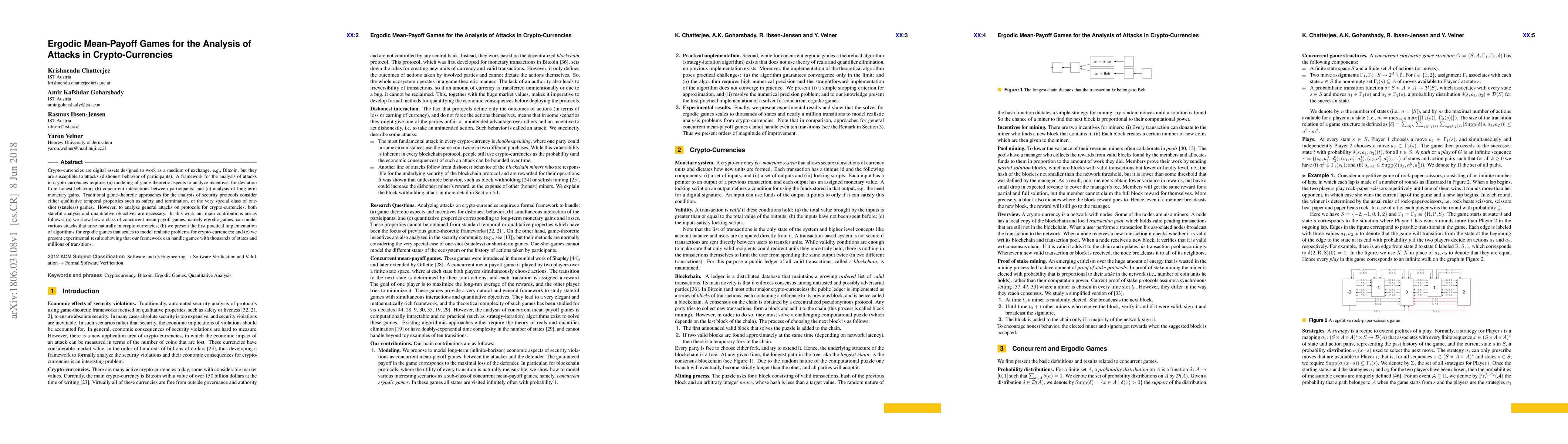Crypto-currencies are digital assets designed to work as a medium of exchange, e.g., Bitcoin, but they are susceptible to attacks (dishonest behavior of participants). A framework for the analysis of attacks in crypto-currencies requires (a) modeling of game-theoretic aspects to analyze incentives for deviation from honest behavior; (b) concurrent interactions between participants; and (c) analysis of long-term monetary gains. Traditional game-theoretic approaches for the analysis of security protocols consider either qualitative temporal properties such as safety and termination, or the very special class of one-shot (stateless) games. However, to analyze general attacks on protocols for crypto-currencies, both stateful analysis and quantitative objectives are necessary. In this work our main contributions are as follows: (a) we show how a class of concurrent mean-payoff games, namely ergodic games, can model various attacks that arise naturally in crypto-currencies; (b) we present the first practical implementation of algorithms for ergodic games that scales to model realistic problems for crypto-currencies; and (c) we present experimental results showing that our framework can handle games with thousands of states and millions of transitions.