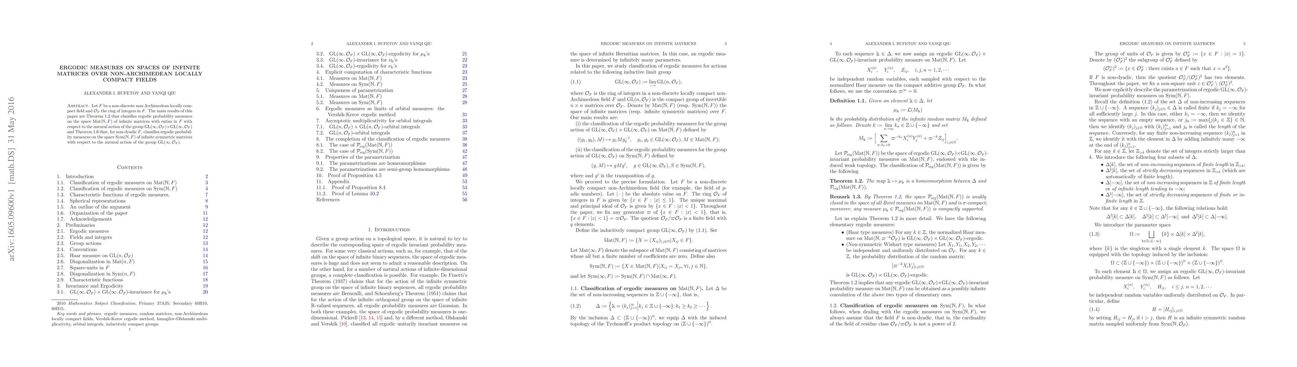 This paper classifies ergodic probability measures on spaces of infinite matrices over non-Archimedean locally compact fields, specifically for $\mathrm{Mat}(\mathbb{N}, F)$ and $\mathrm{Sym}(\mathbb{N}, F)$ under the actions of certain groups. The classifications are achieved through Theorem 1.2 and Theorem 1.6 for non-dyadic fields.