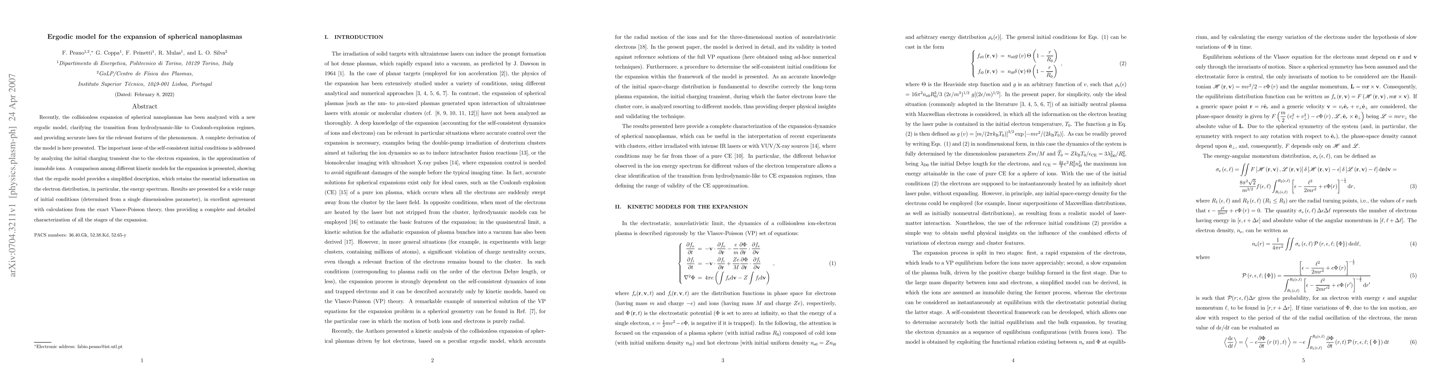 This paper presents an ergodic model for the collisionless expansion of spherical nanoplasmas, detailing the transition from hydrodynamic to Coulomb explosion regimes. The model accurately describes the electron distribution and energy spectrum, offering a simplified yet effective approach compared to kinetic models.