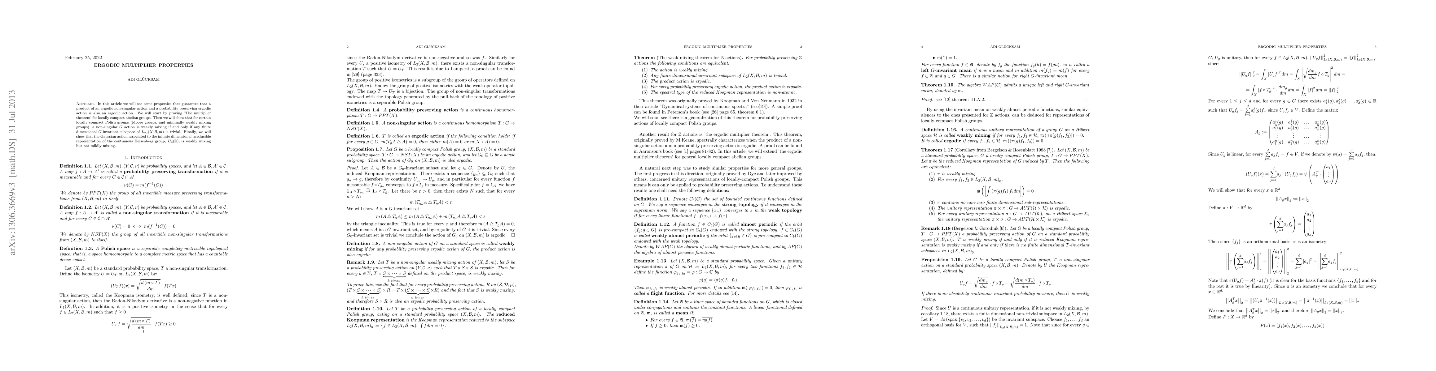 In this article we will see some properties that guarantee that a product of an ergodic non-singular action and a probability preserving ergodic action is also an ergodic action. We will start by proving 'The multiplier theorem' for locally compact abelian groups. Then we will show that for certain locally compact Polish groups (Moore groups, and minimally weakly mixing groups), a non-singular G action is weakly mixing if and only if any finite dimensional G-invariant subspace of L_\infty is trivial. Finally, we will show that the Gaussian action associated to the infinite dimensional irreducible representation of the continuous Heisenberg group, H_3, is weakly mixing but not mildly mixing.