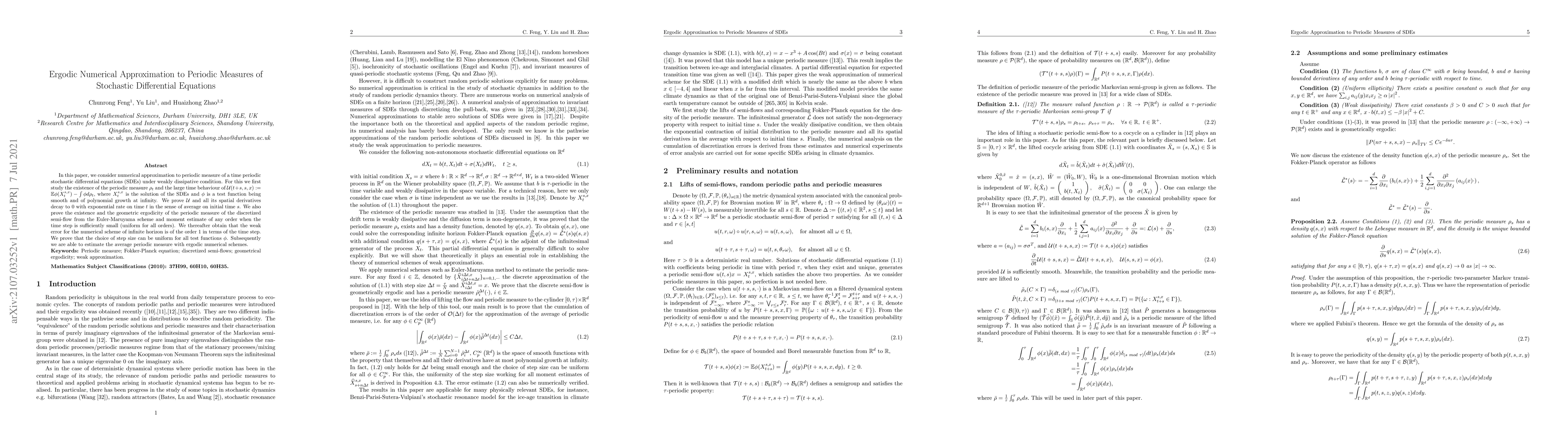 This paper studies numerical approximations for periodic measures in time-periodic stochastic differential equations under weakly dissipative conditions. It proves the decay of errors and the existence of geometric ergodicity for discretized semi-flows, establishing weak error bounds and uniform step size choices for ergodic numerical schemes.