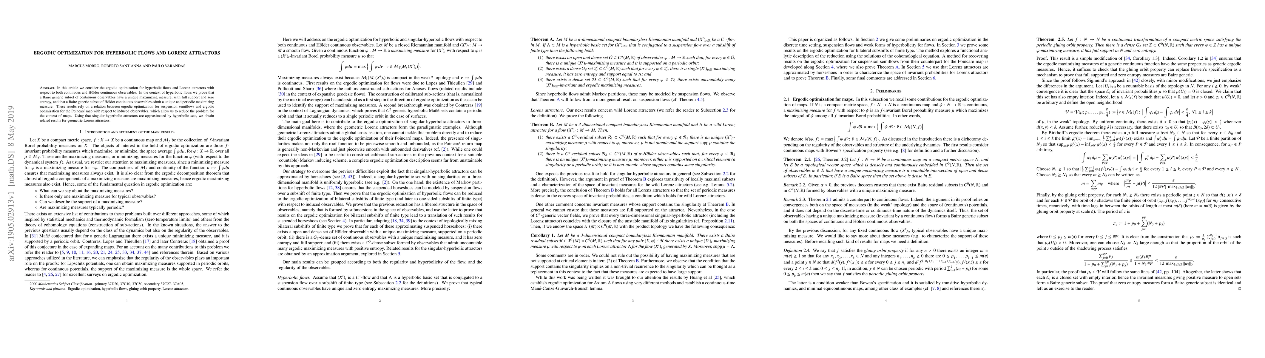 This paper explores ergodic optimization for hyperbolic flows and Lorenz attractors, proving that a Baire generic subset of continuous observables has a unique maximizing measure with zero entropy, while a subset of Holder continuous observables admits a unique periodic maximizing measure. The results leverage connections between suspension semiflows and the Poincaré map for induced observables.