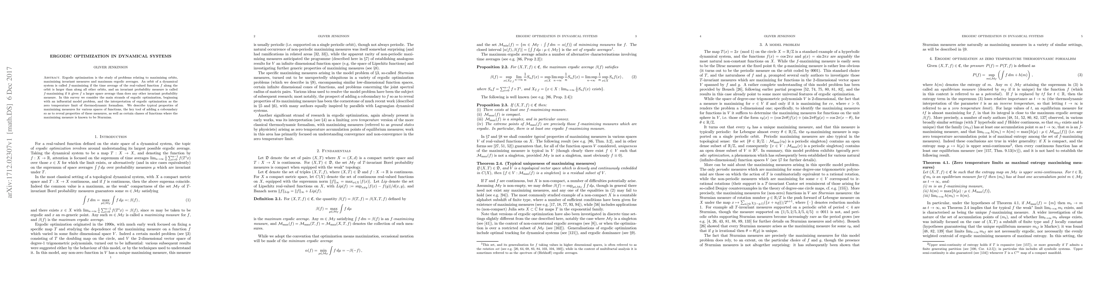 Ergodic optimization is the study of problems relating to maximizing orbits, maximizing invariant measures and maximum ergodic averages. An orbit of a dynamical system is called f-maximizing if the time average of the real-valued function f along the orbit is larger than along all other orbits, and an invariant probability measure is called f-maximizing if it gives f a larger space average than does any other invariant probability measure. In this survey we consider the main strands of ergodic optimization, beginning with an influential model problem, and the interpretation of ergodic optimization as the zero temperature limit of thermodynamic formalism. We describe typical properties of maximizing measures for various spaces of functions, the key tool of adding a coboundary so as to reveal properties of these measures, as well as certain classes of functions where the maximizing measure is known to be Sturmian.