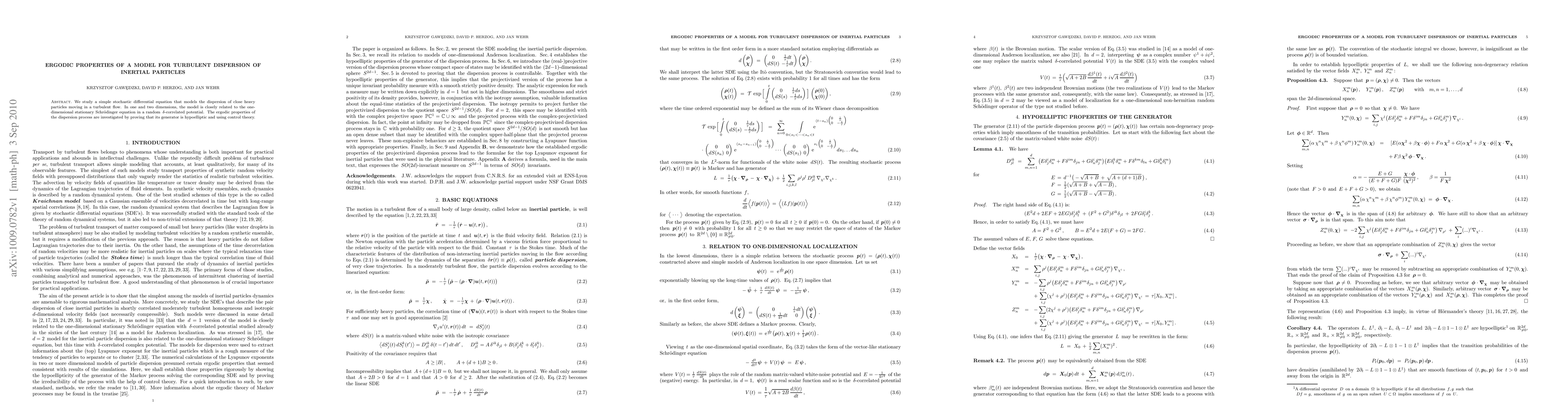 This paper investigates the ergodic properties of a stochastic differential equation modeling turbulent dispersion of inertial particles, proving the generator's hypoellipticity and employing control theory to analyze the process. The model is analogous to the one-dimensional stationary Schrödinger equation in a random potential.