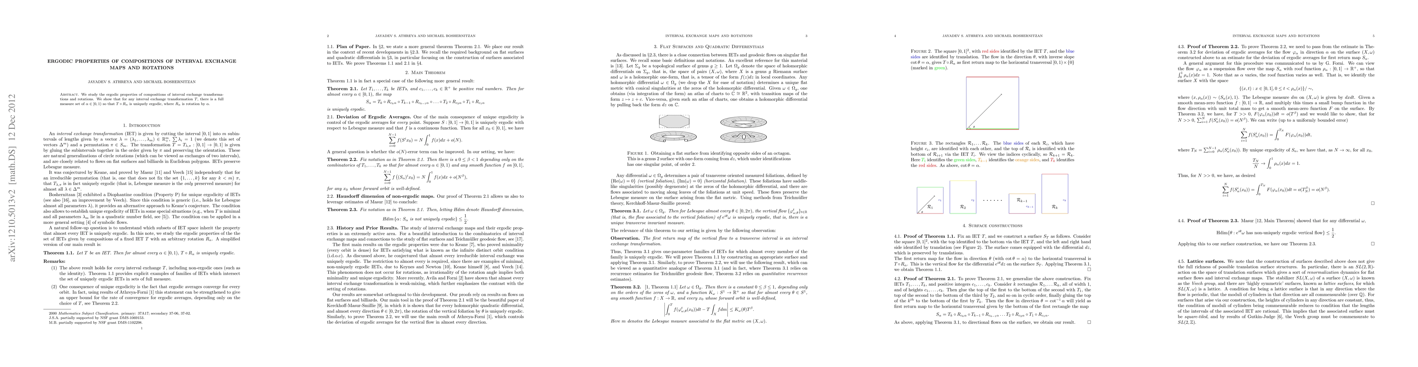 Summary: This paper investigates the ergodic properties of compositions involving interval exchange transformations and rotations. It demonstrates that for any interval exchange transformation, there exists a full measure set of rotation angles ensuring the composed transformation is uniquely ergodic.