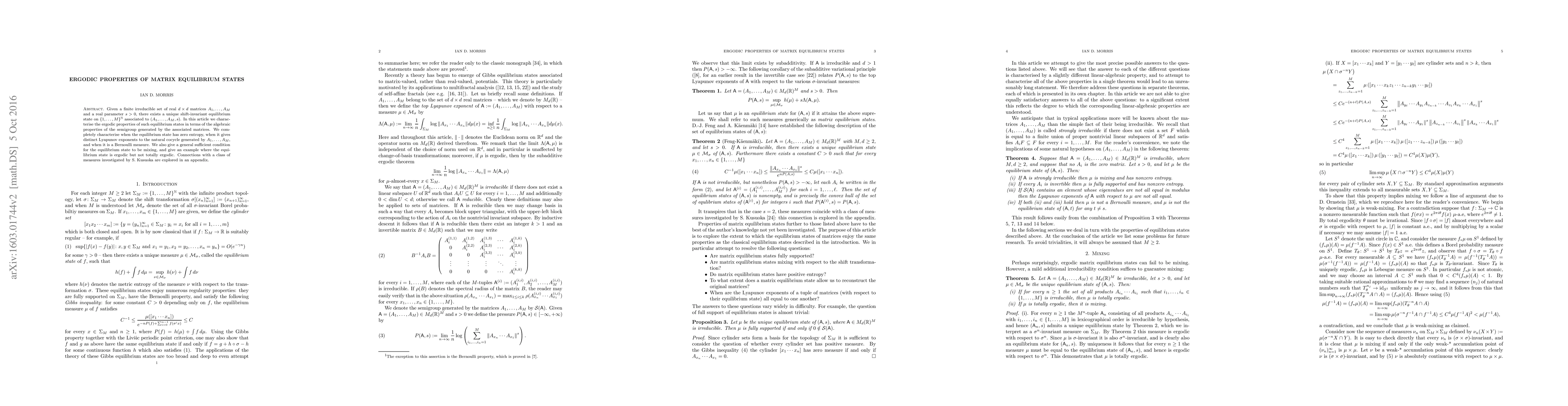 This research paper characterizes the ergodic properties of equilibrium states for a finite set of matrices, exploring conditions for zero entropy, distinct Lyapunov exponents, and Bernoulli measures, with implications for mixing behavior.