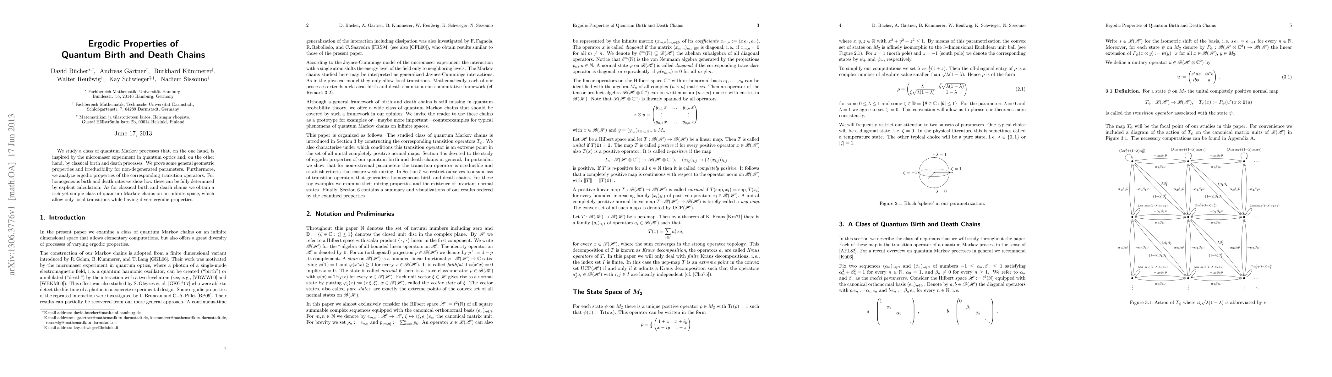 The paper presents detailed proofs of irreducibility and geometric properties for quantum birth and death chains, along with explicit calculations for ergodic properties of transition operators.