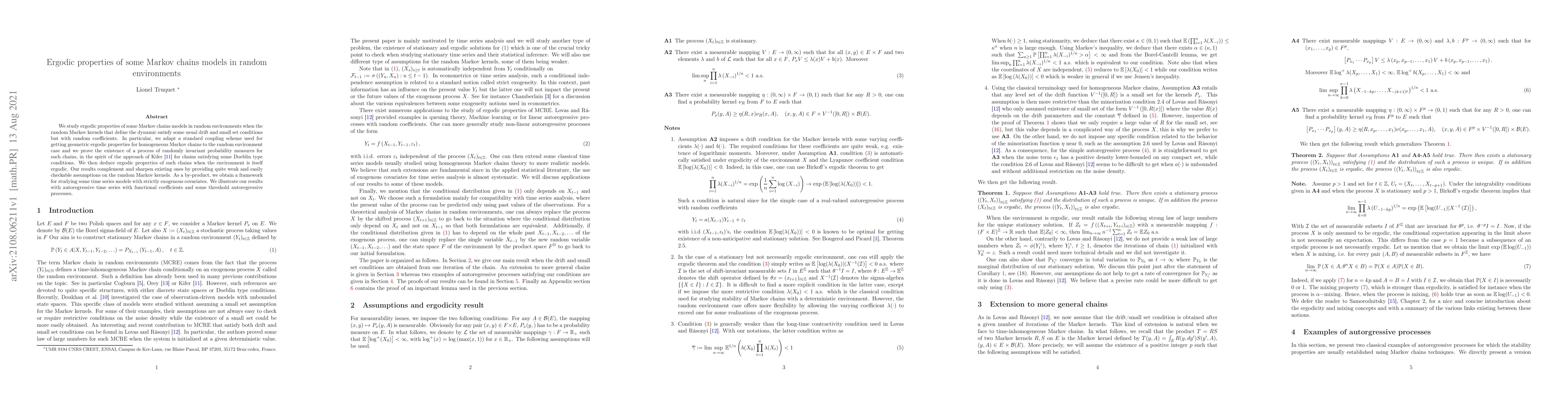This paper investigates the ergodic properties of Markov chains in random environments under weak drift conditions. It adapts a coupling scheme to prove the existence of randomly invariant probability measures and deduces ergodic properties when the environment is ergodic, complementing existing results with simpler assumptions. The findings also apply to time series models with exogenous covariates, exemplified by autoregressive models with functional coefficients.