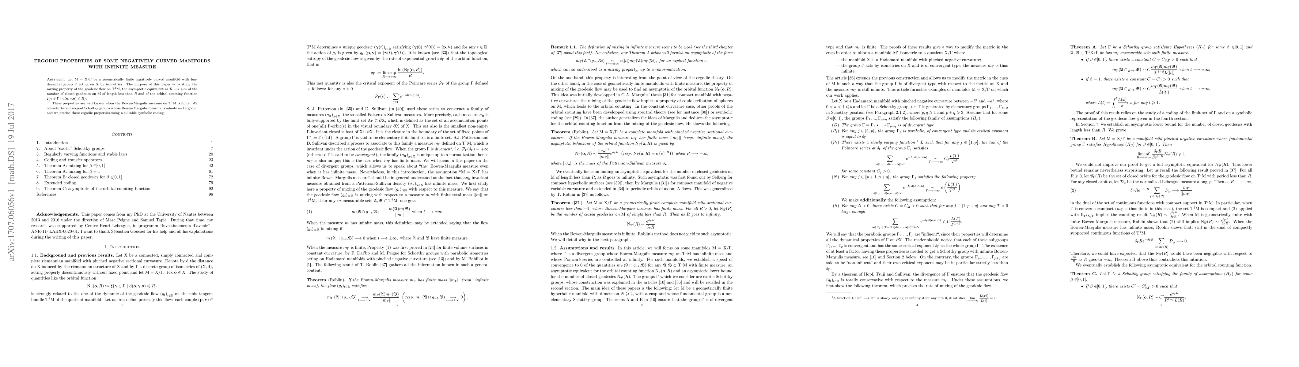 Let $M=X/\Gamma$ be a geometrically finite negatively curved manifold with fundamental group $\Gamma$ acting on $X$ by isometries. The purpose of this paper is to study the mixing property of the geodesic flow on $T^1M$, the asymptotic equivalent as $R\longrightarrow+\infty$ of the number of closed geodesics on $M$ of length less than $R$ and of the orbital counting function $\sharp\{\gamma\in\Gamma\ |\ d(o,\gamma.o)\le R\}$. These properties are well known when the Bowen-Margulis measure on $T^1M$ is finite. We consider here divergent Schottky groups whose Bowen-Margulis measure is infinite and ergodic, and we precise these ergodic properties using a suitable symbolic coding.