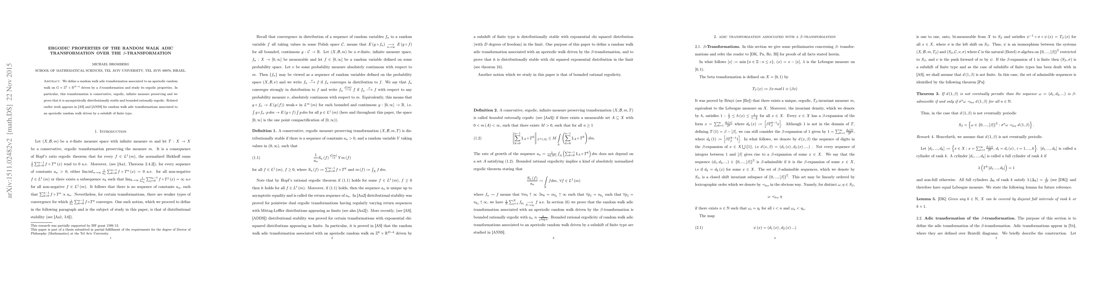 This paper investigates the ergodic properties of a random walk adic transformation driven by a $\beta$-transformation, proving it is conservative, ergodic, and asymptotically distributionally stable. It also establishes the transformation's infinite measure preservation and bounded rational ergodicity.