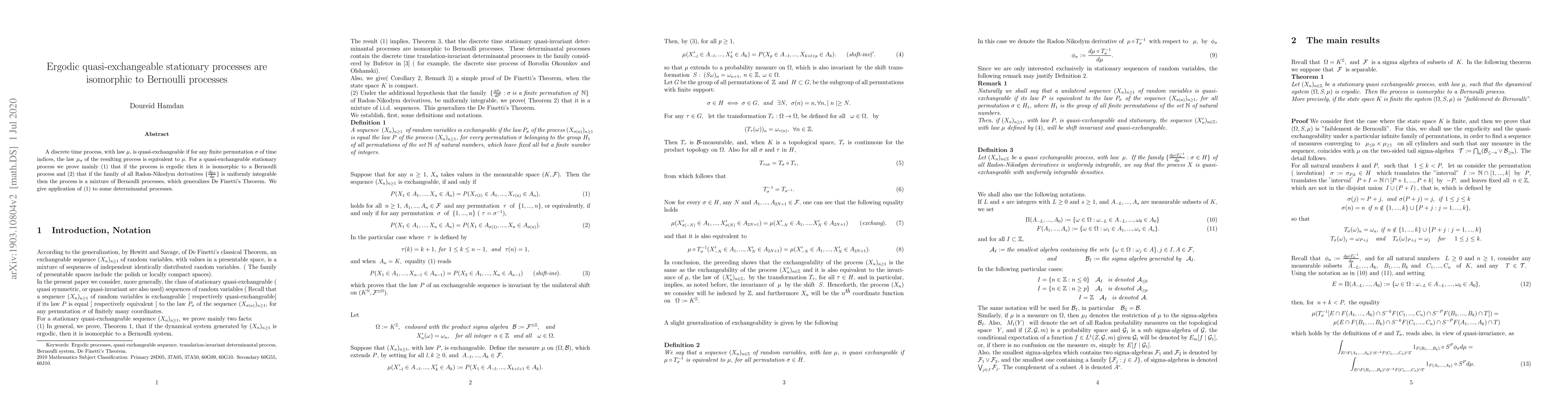 A quasi-exchangeable stationary process is isomorphic to a Bernoulli process if it is ergodic, and can also be expressed as a mixture of Bernoulli processes under certain conditions.